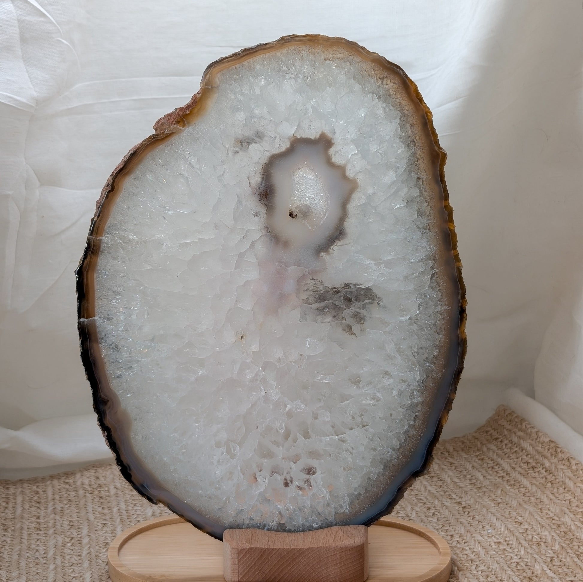 Große Achatscheibe mit Teelichthalter aus Holz, kann aber auch getrennt davon genutzt werden – beispielsweise als Unterlage.