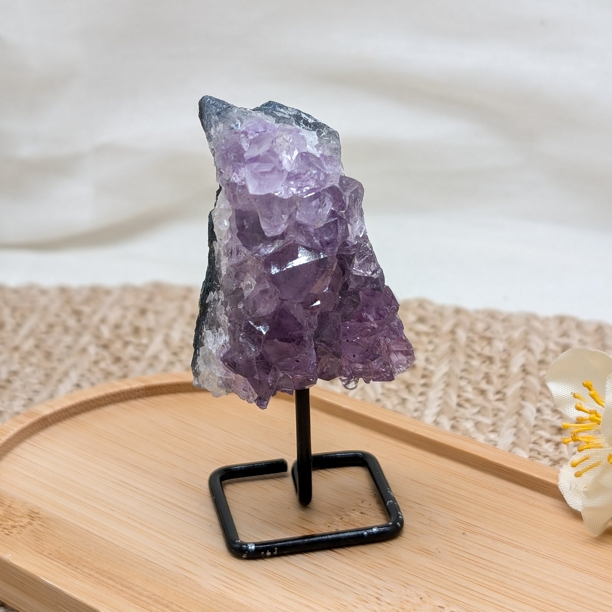 Der Amethyst gehört zur Gruppe der Quarze und kommt in verschiedenen Fliedertönen vor. Seine violette Farbe erhält er durch Beimengungen von Metallen wie z.B. Eisen. Amethyst bildet sich vorrangig in Drusen, also in Hohlräumen im Gestein, die von vulkanischen Gasblasen erzeugt werden. Amethyst sollte nicht direkt in der Sonne stehen, da seine Farbe so verblassen kann. Erhitzt man Amethyst auf etwa 500 Grad Celsius entsteht gebrannter Citrin, sprich das Mineral verändert unter Hitze seine Farbe.