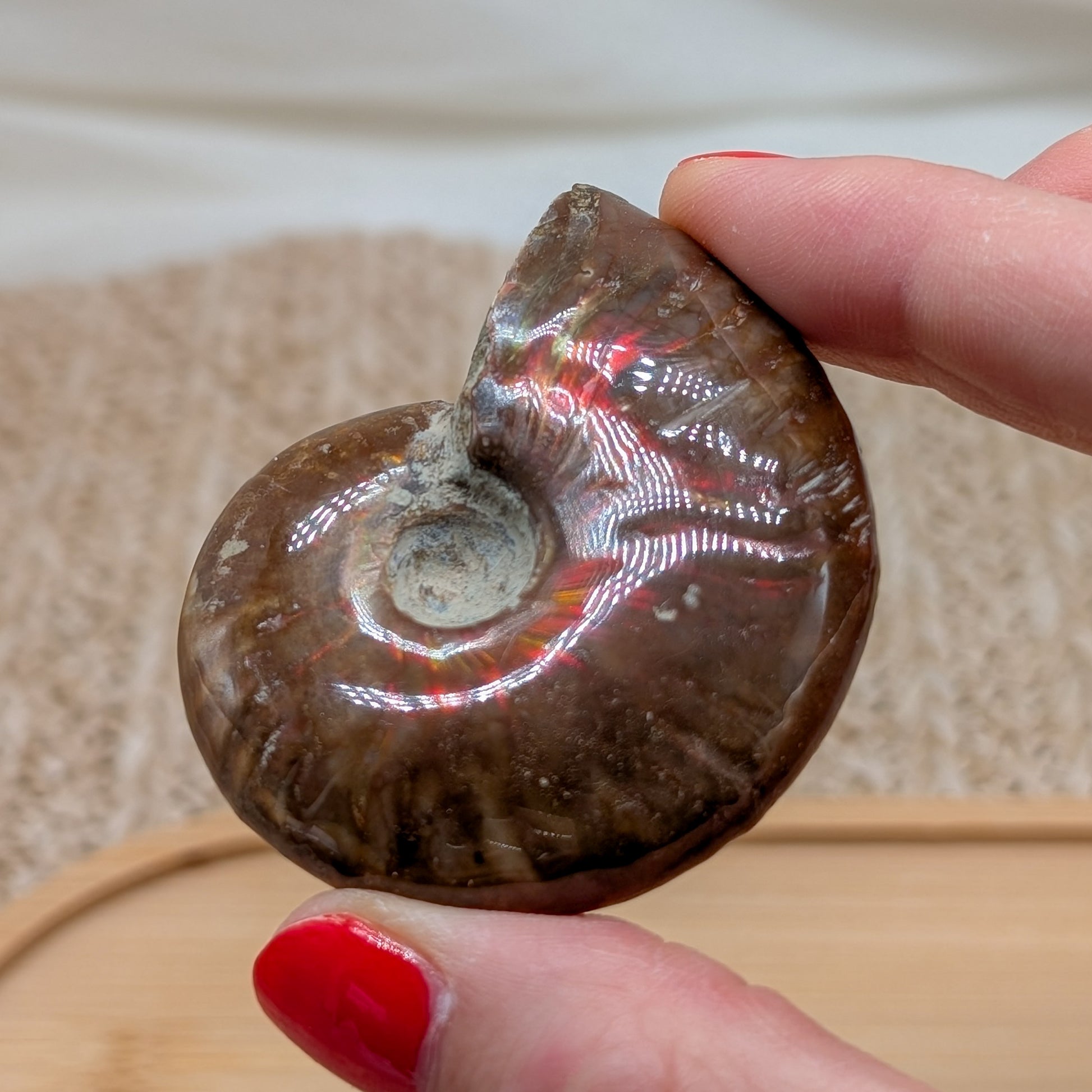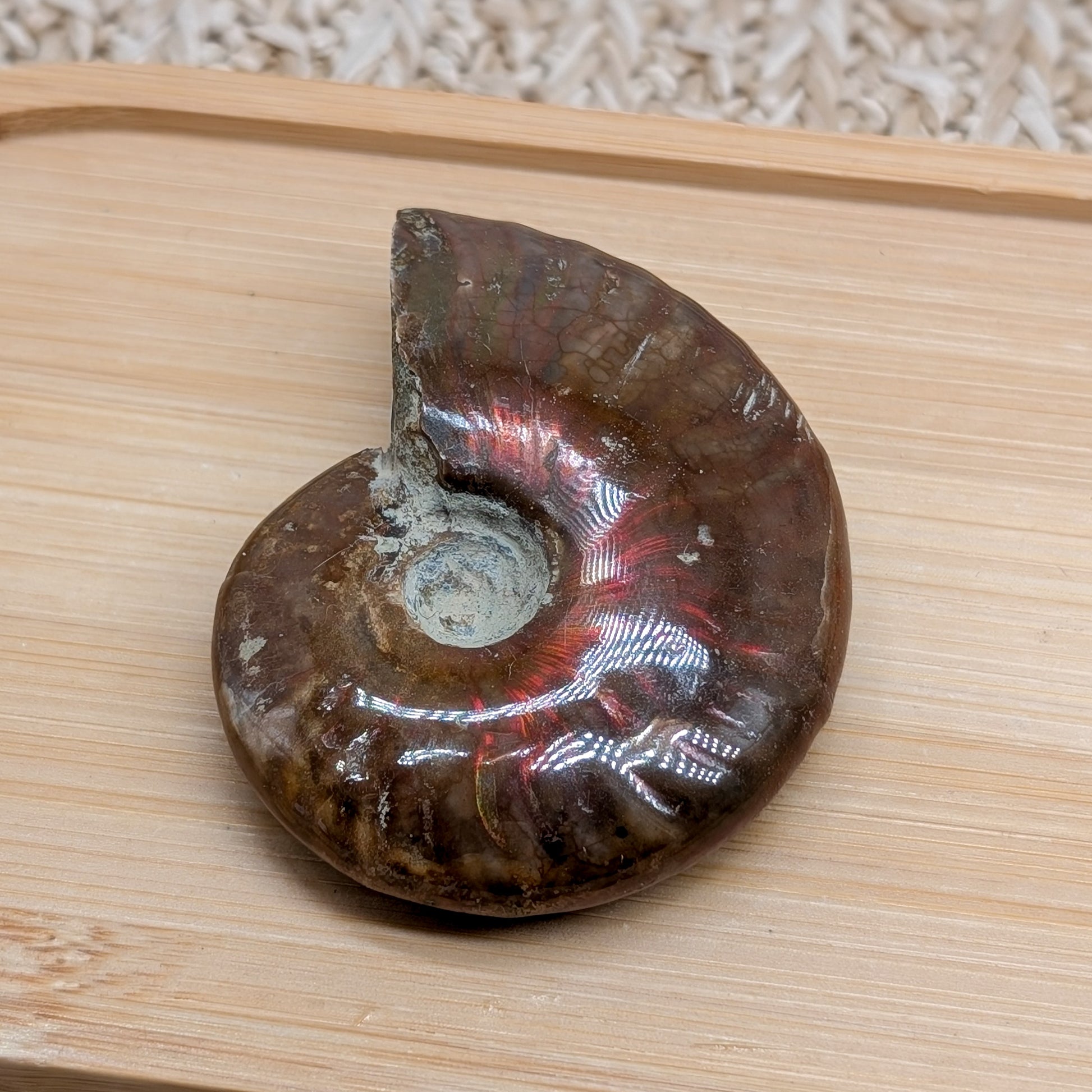 Natürlicher Ammonit mit schöner glänzender Oberfläche und intensivem Schimmer in rot / grün