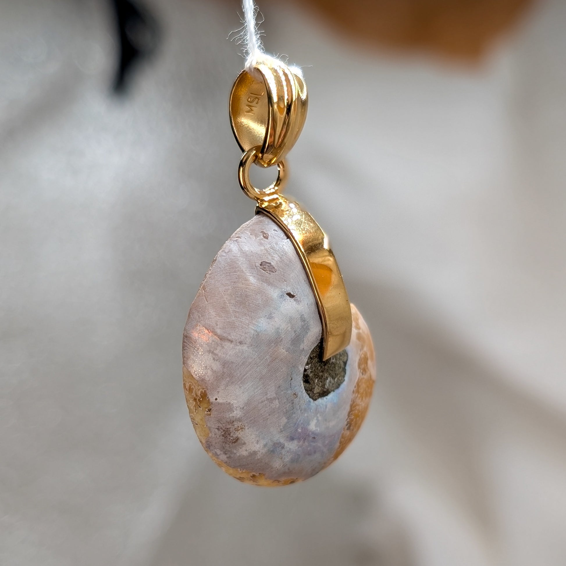 Ammonit Kettenanhänger mit Öse aus 925er Silber mit hochwertiger Vergoldung und bunt schimmernder Rückseite.