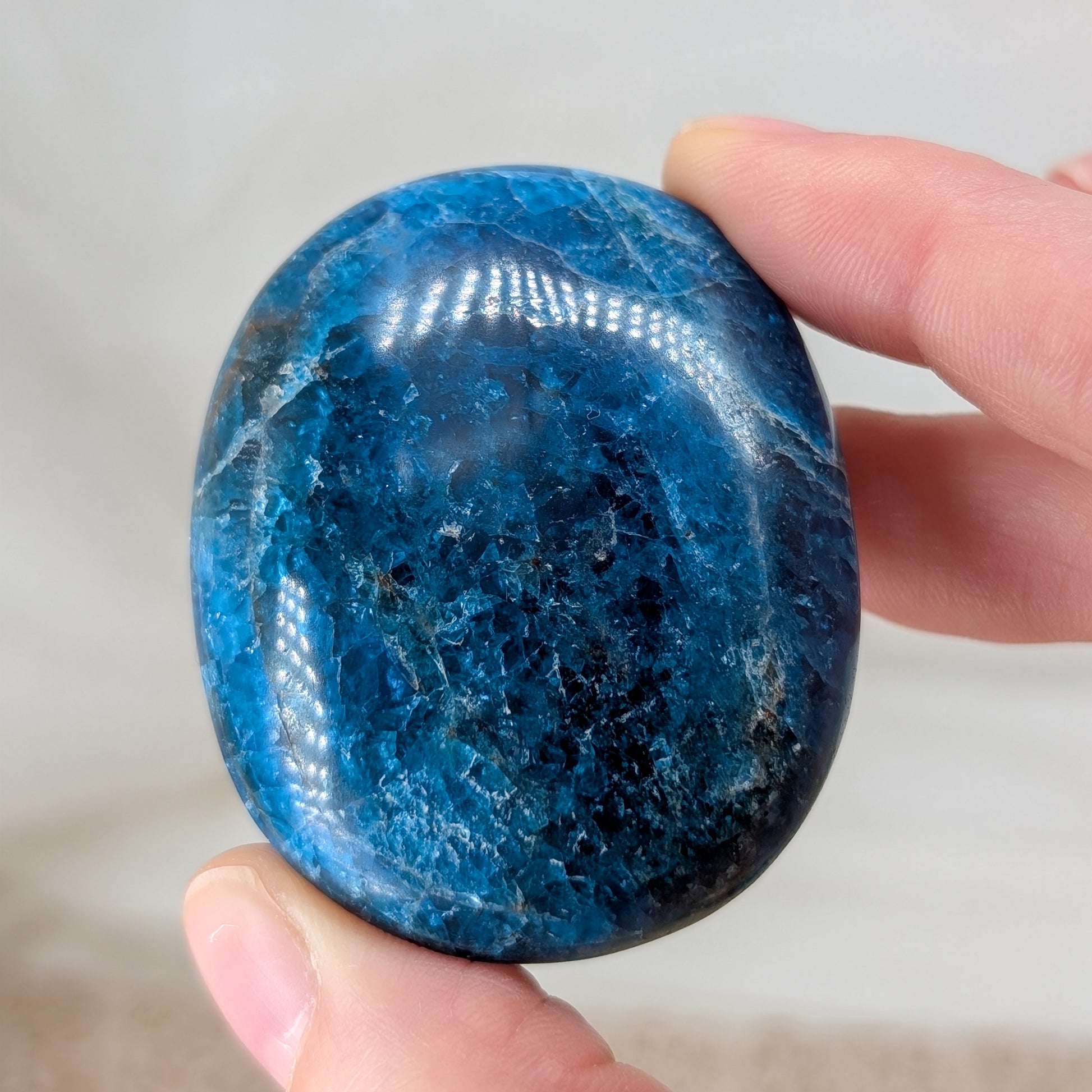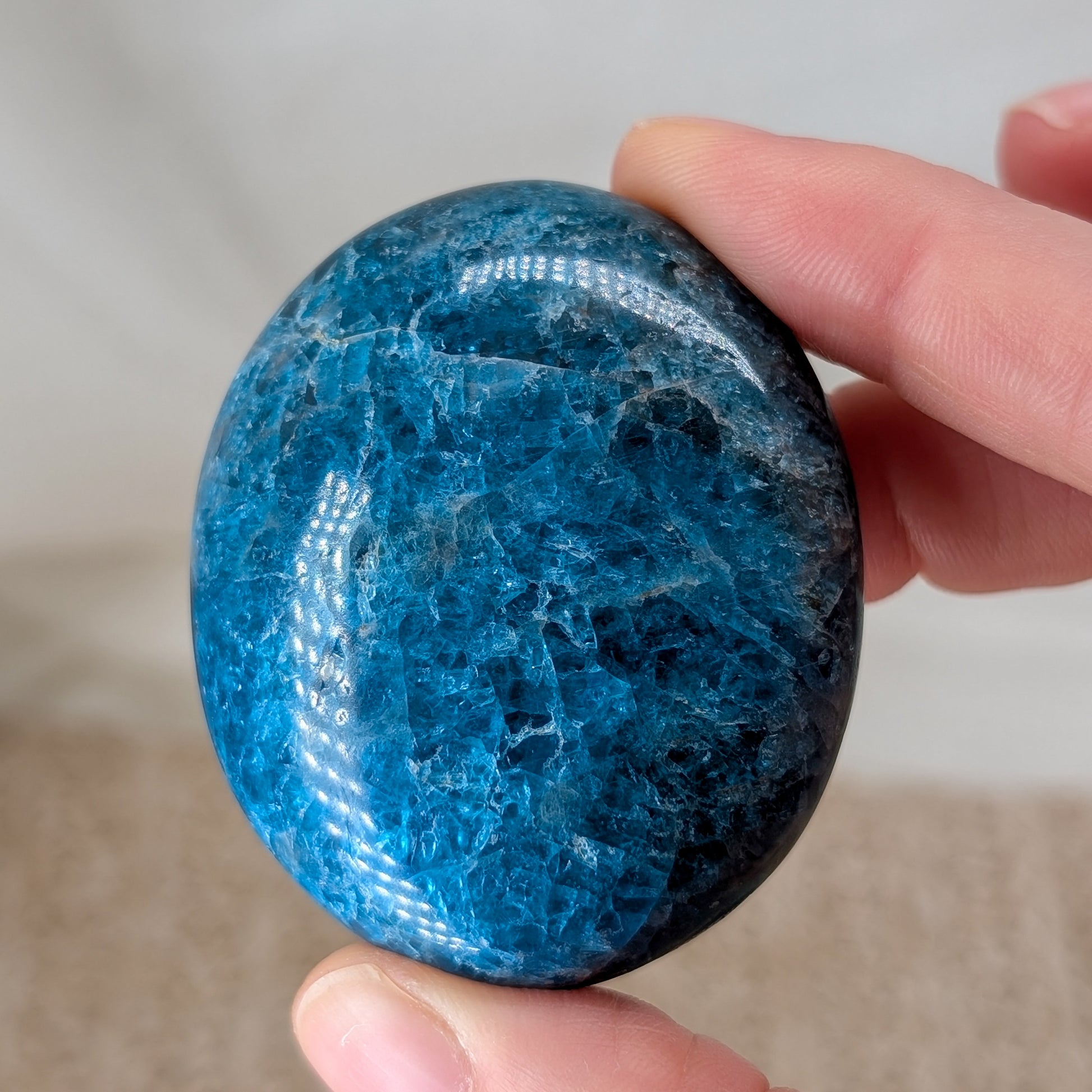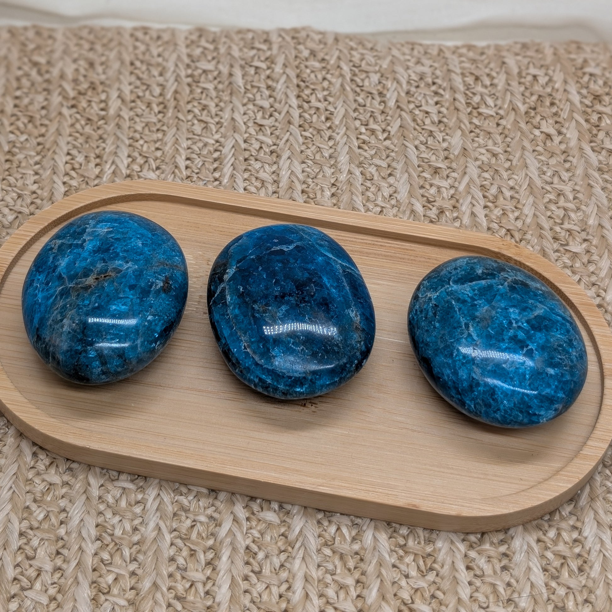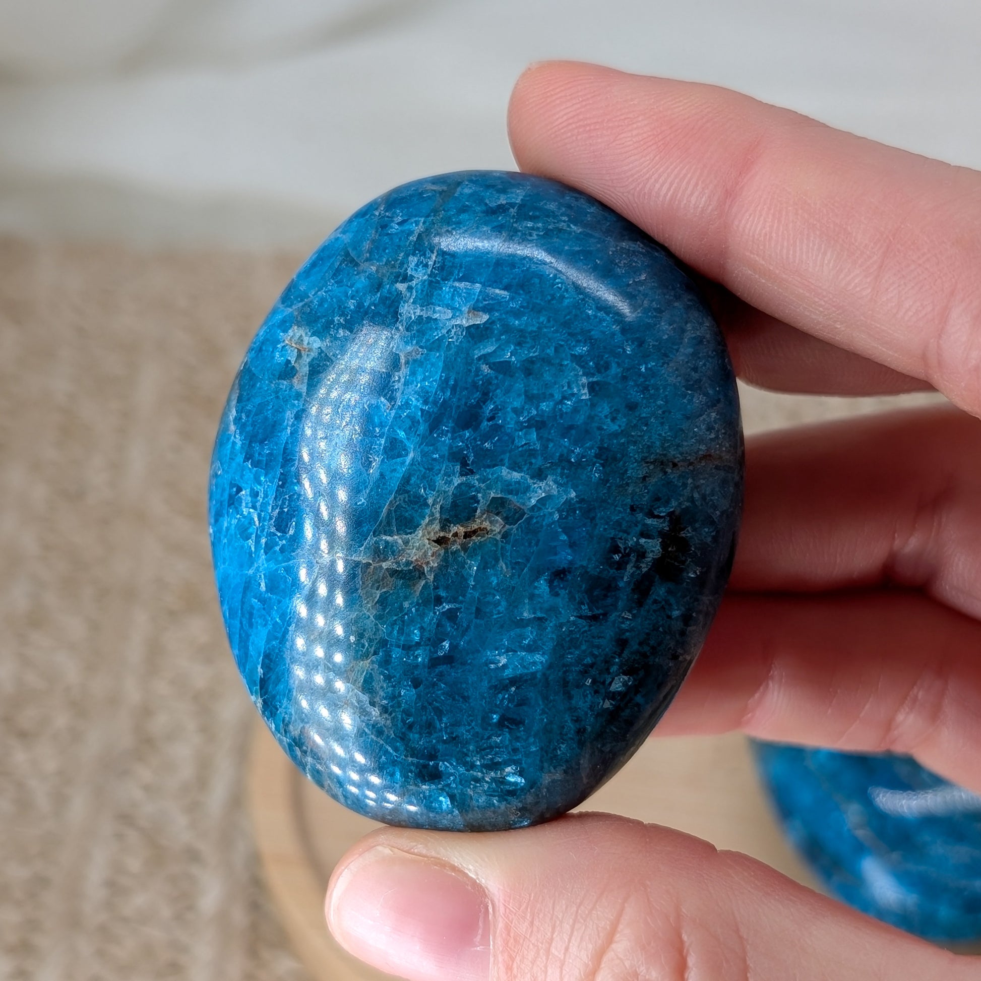 Apatit Handstein in tiefblau und schimmernder in drei Varianten: