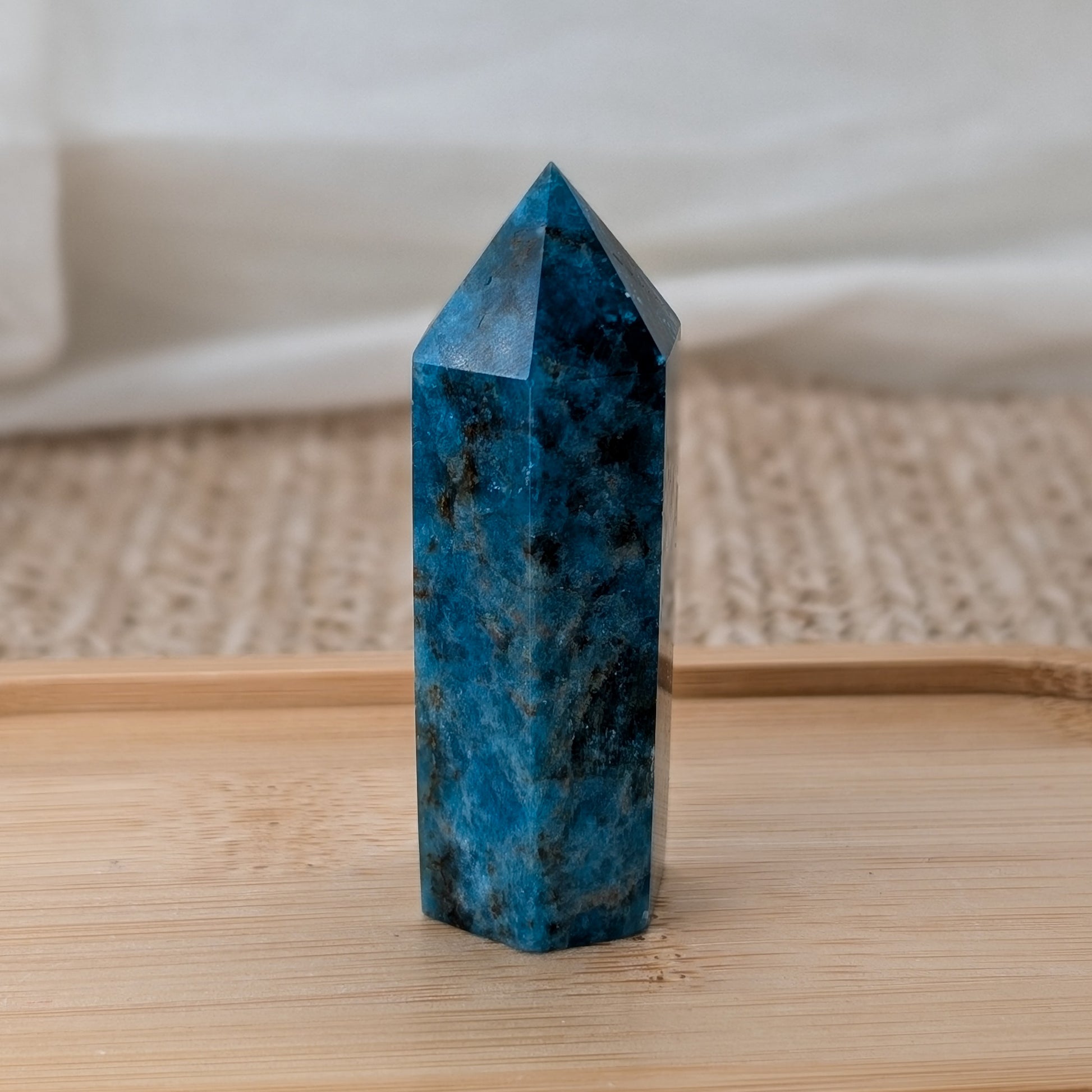 Schimmernder Apatit Turm in tiefblau mit Glitzer und Schimmer auf der Fläche