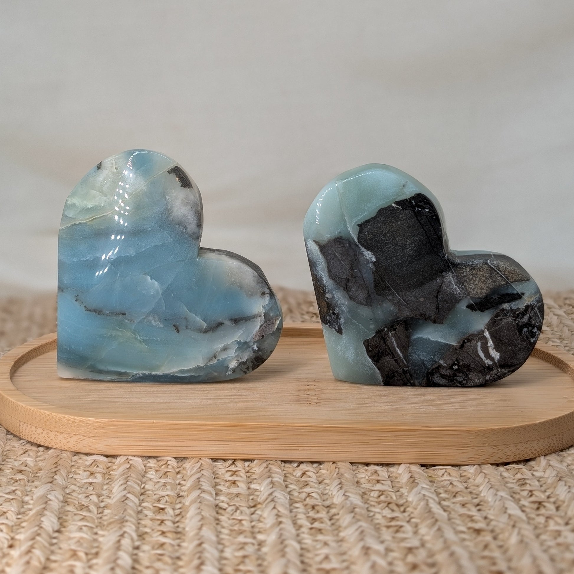 Blauer Calcit Herz in schönem türkis blau mit Muster und Hämatit Anteil
