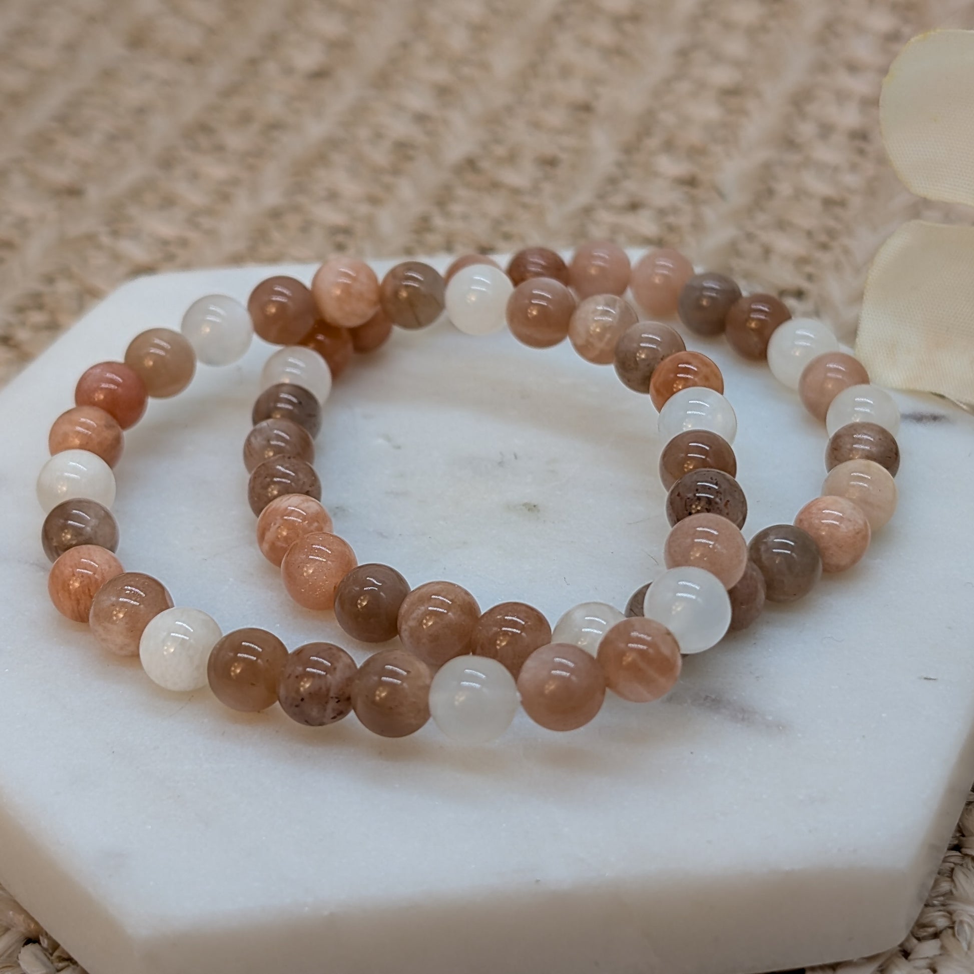 Buntes Mondstein Armband mit Perlen auf elastischem Gummiband. Die Farben variieren von weiß über Pfirsich bis orange und grau.