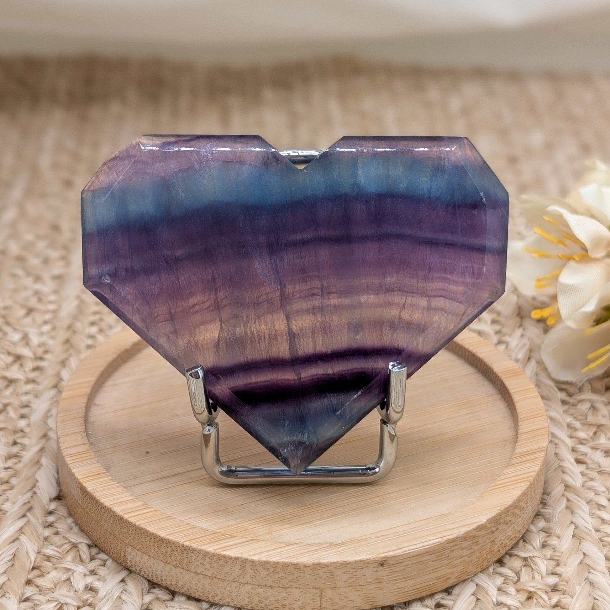 Fluorit Herz in geometrische geschliffener Form mit schöner Bänderung in lila, grün und blau