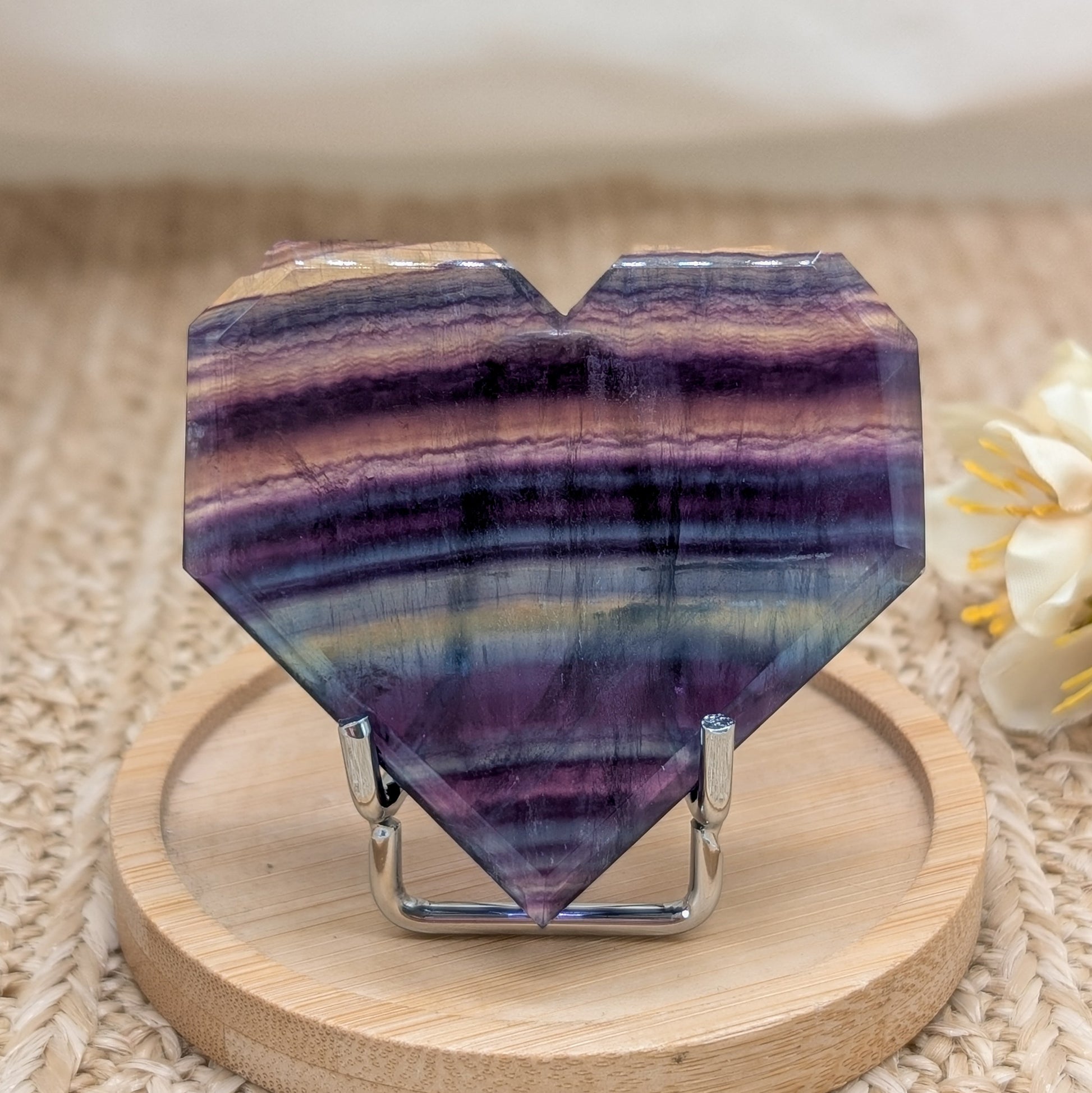 Fluorit Herz in geometrische geschliffener Form mit schöner Bänderung in lila, grün und blau