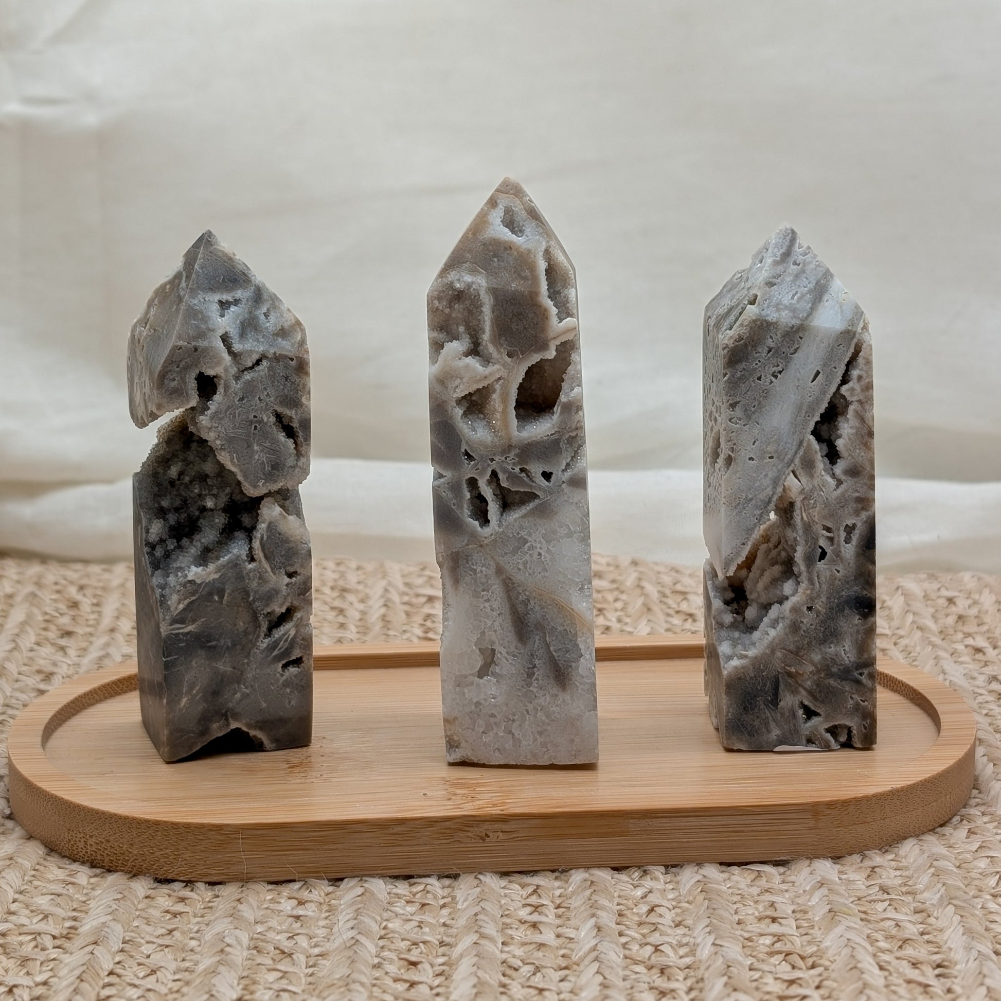 Druzy Quarz Turm in 3 glitzernden Varianten mit offenen großen Drusen. Wird fälschlicherweise oft als Sphalerit bezeichnet.