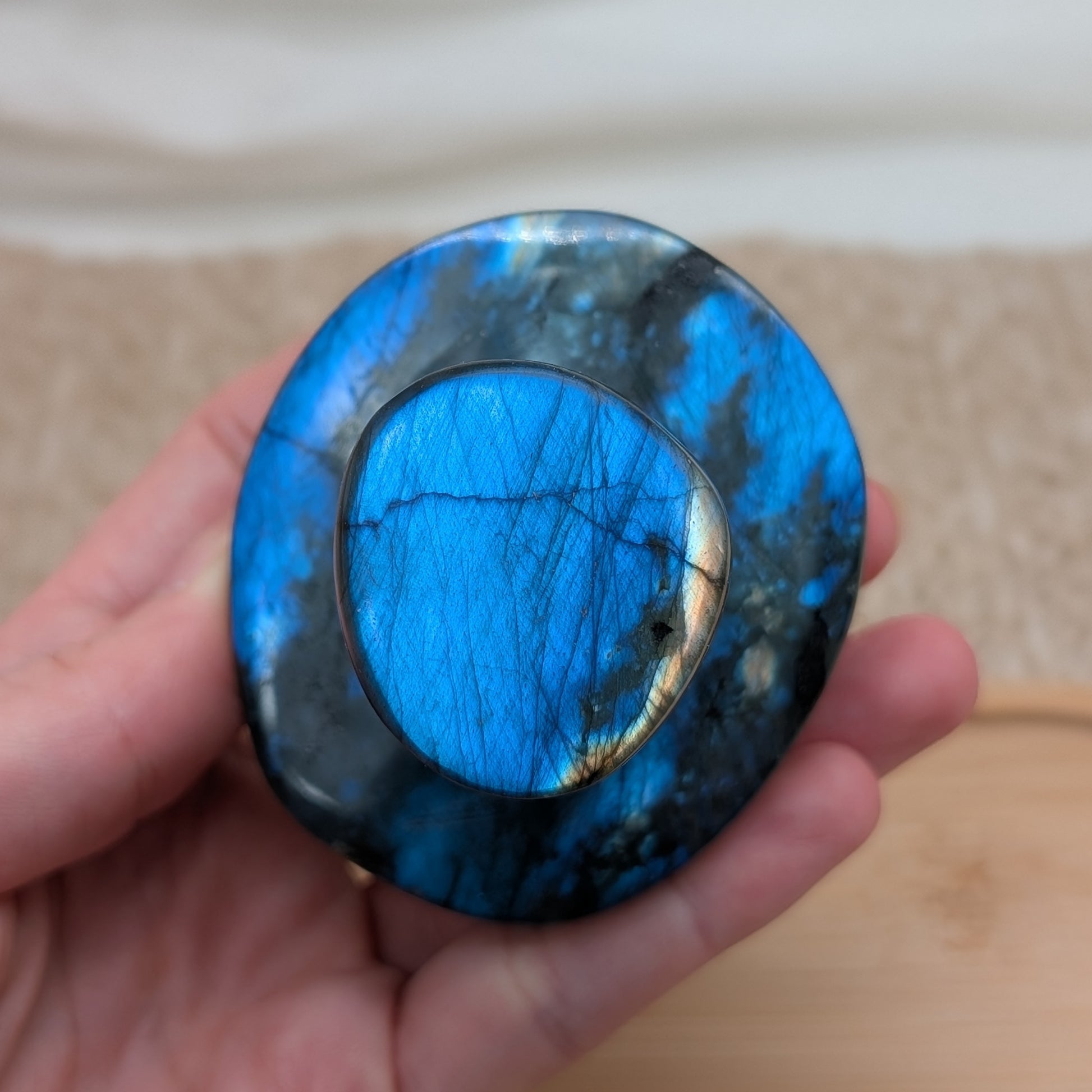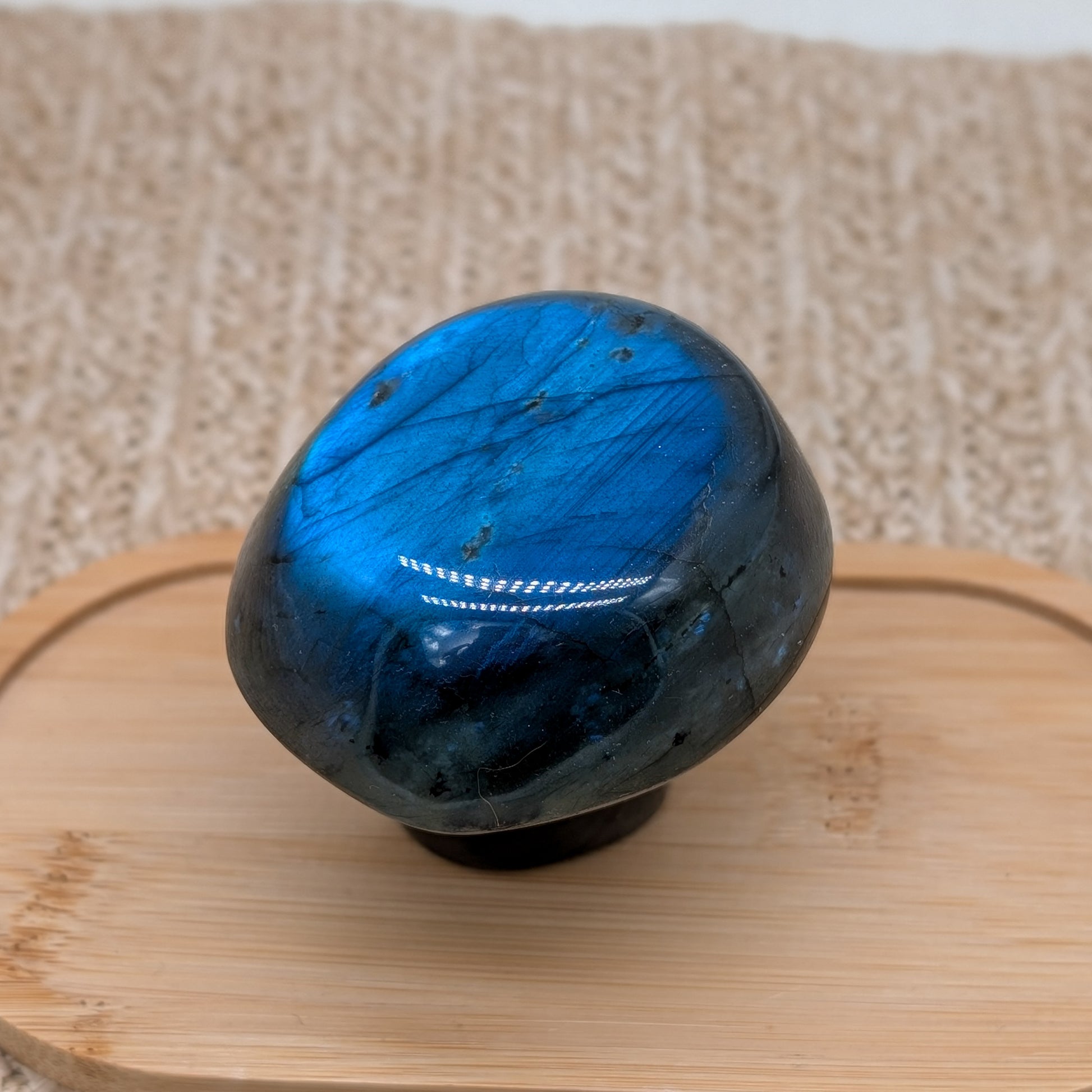 Labradorit Pilz mit ausgeprägtem Blauflash auf Ober- und Unterseite sowie Glitzer auf der ganzen Schnitzerei.
