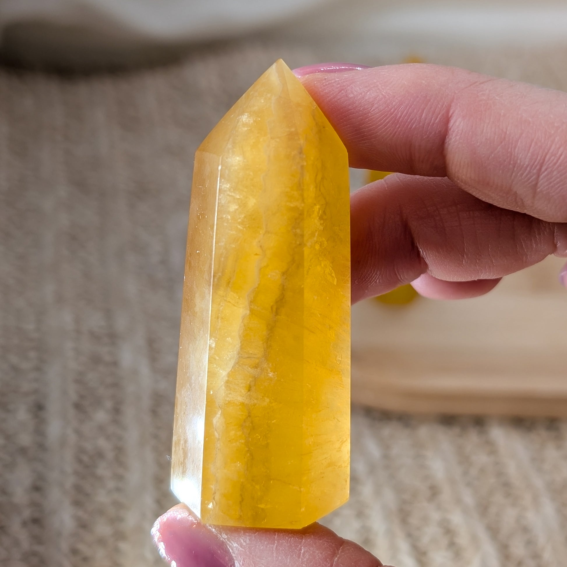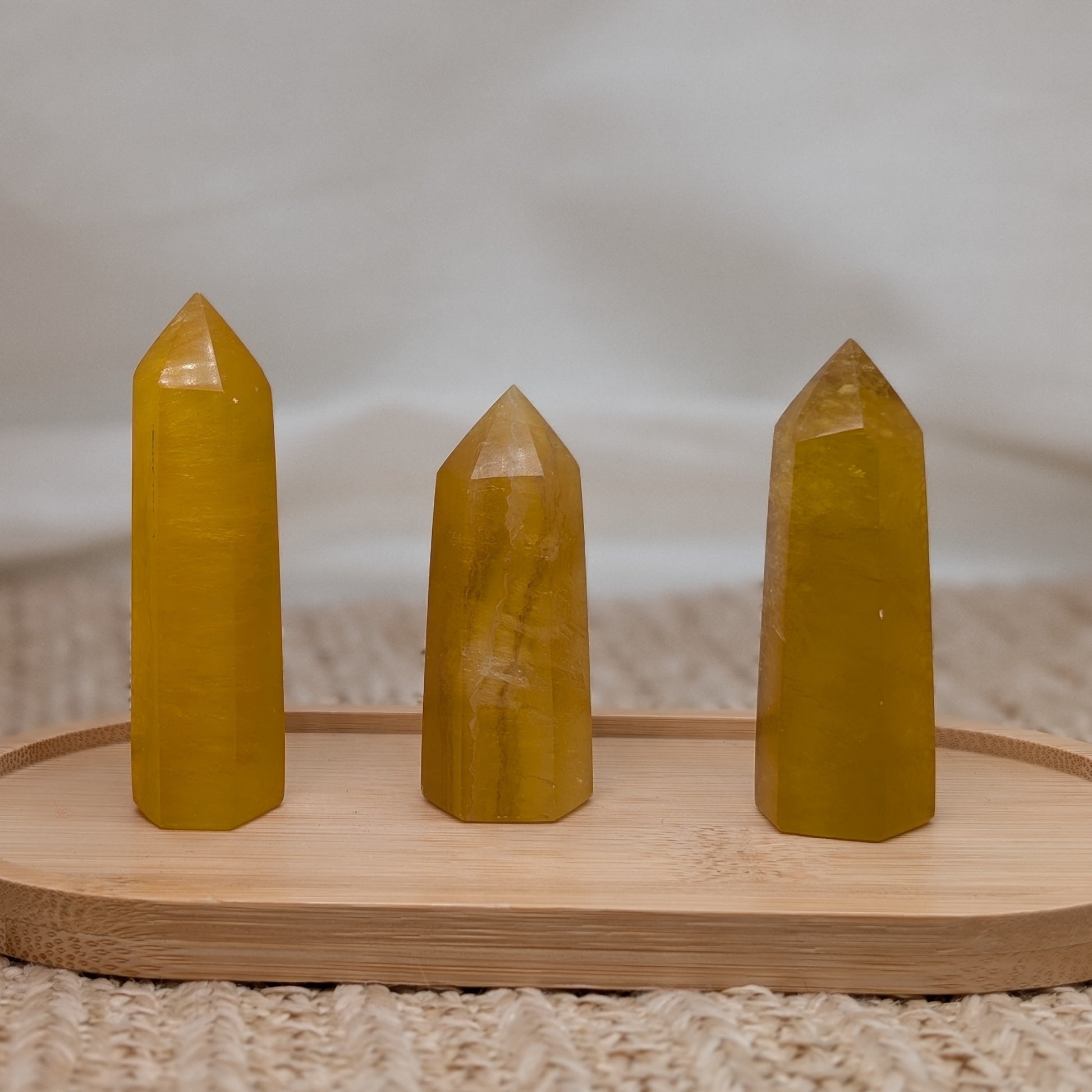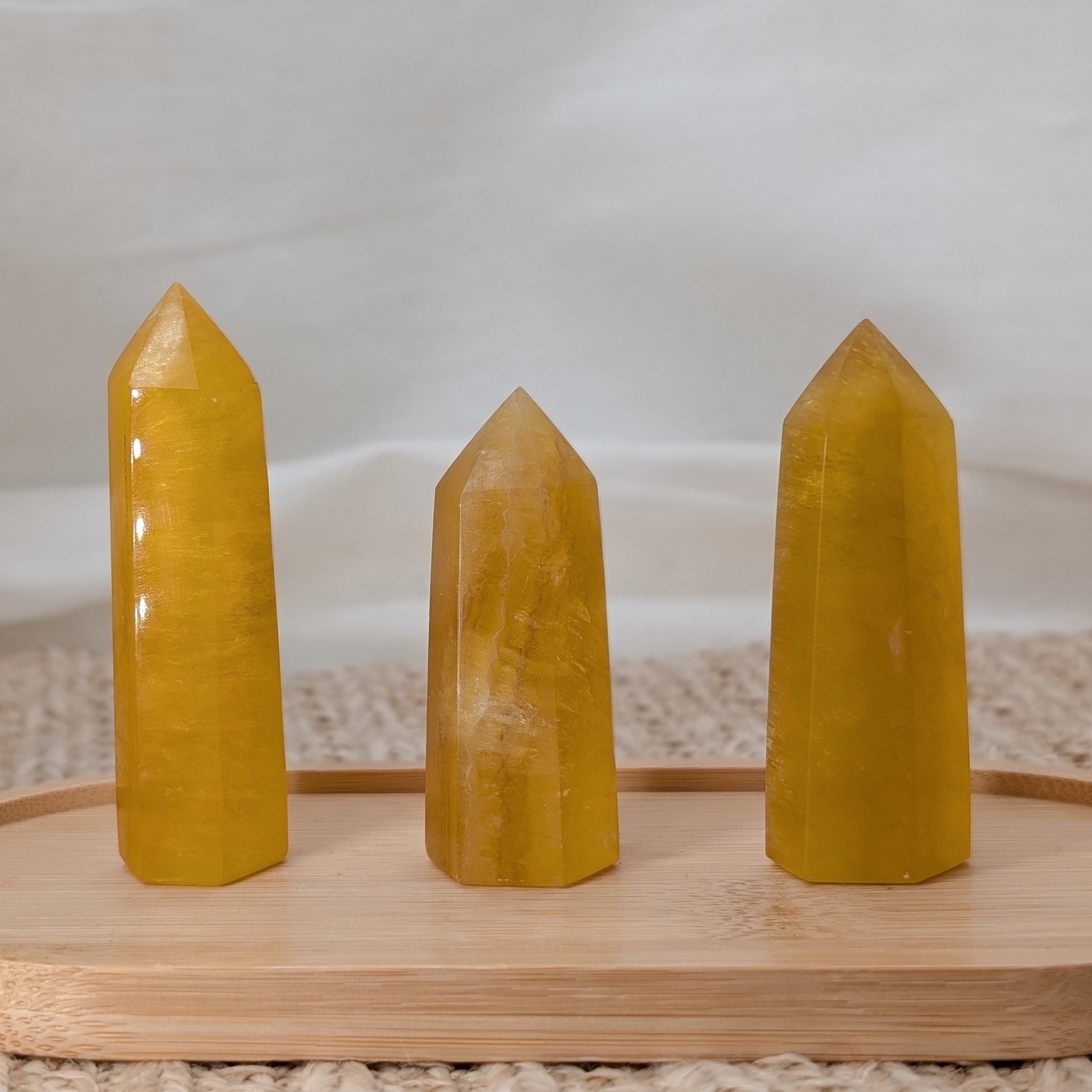 Schöner gelber Fluorit Turm, teilweise mit transparenten Teilen, in drei unterschiedlichen Größen.