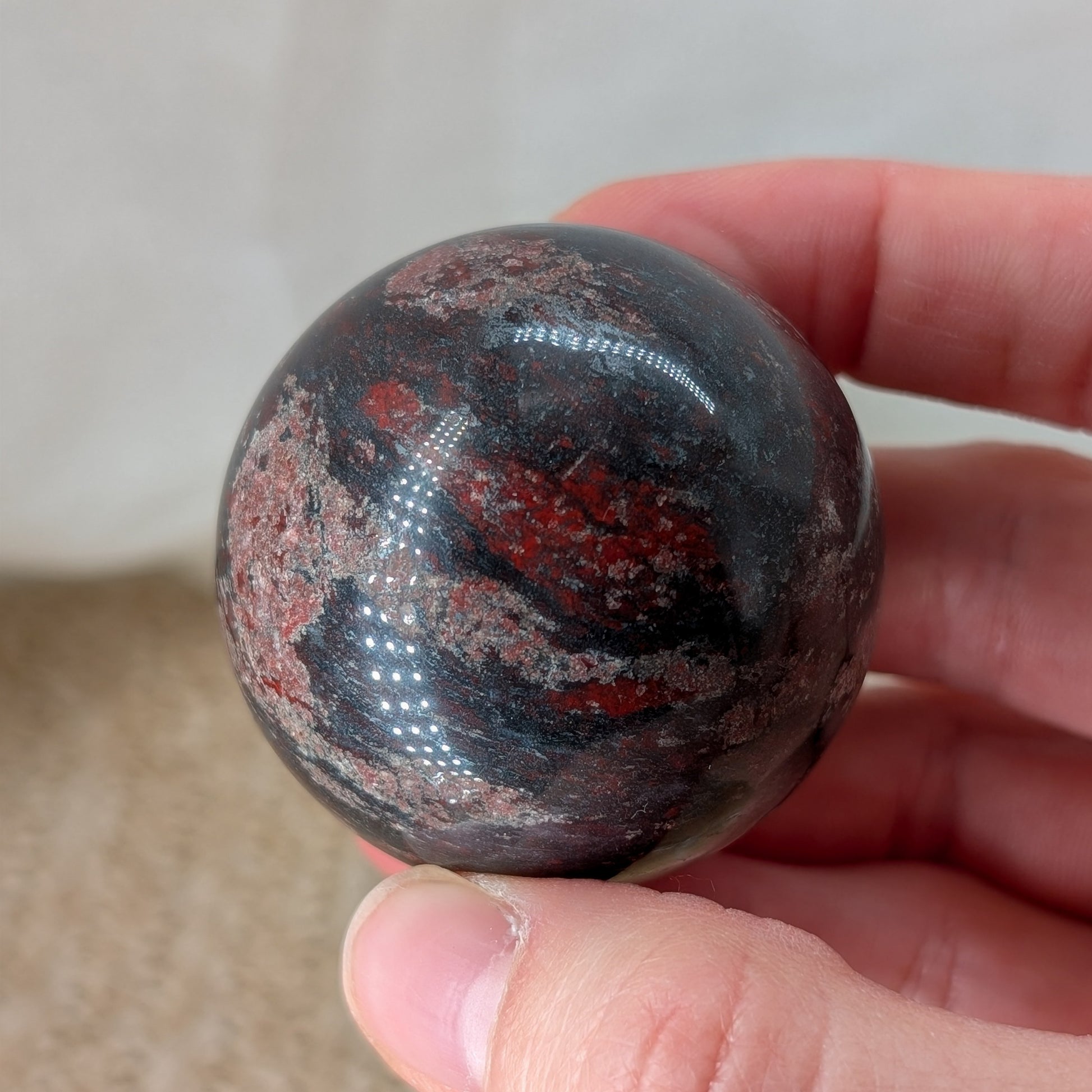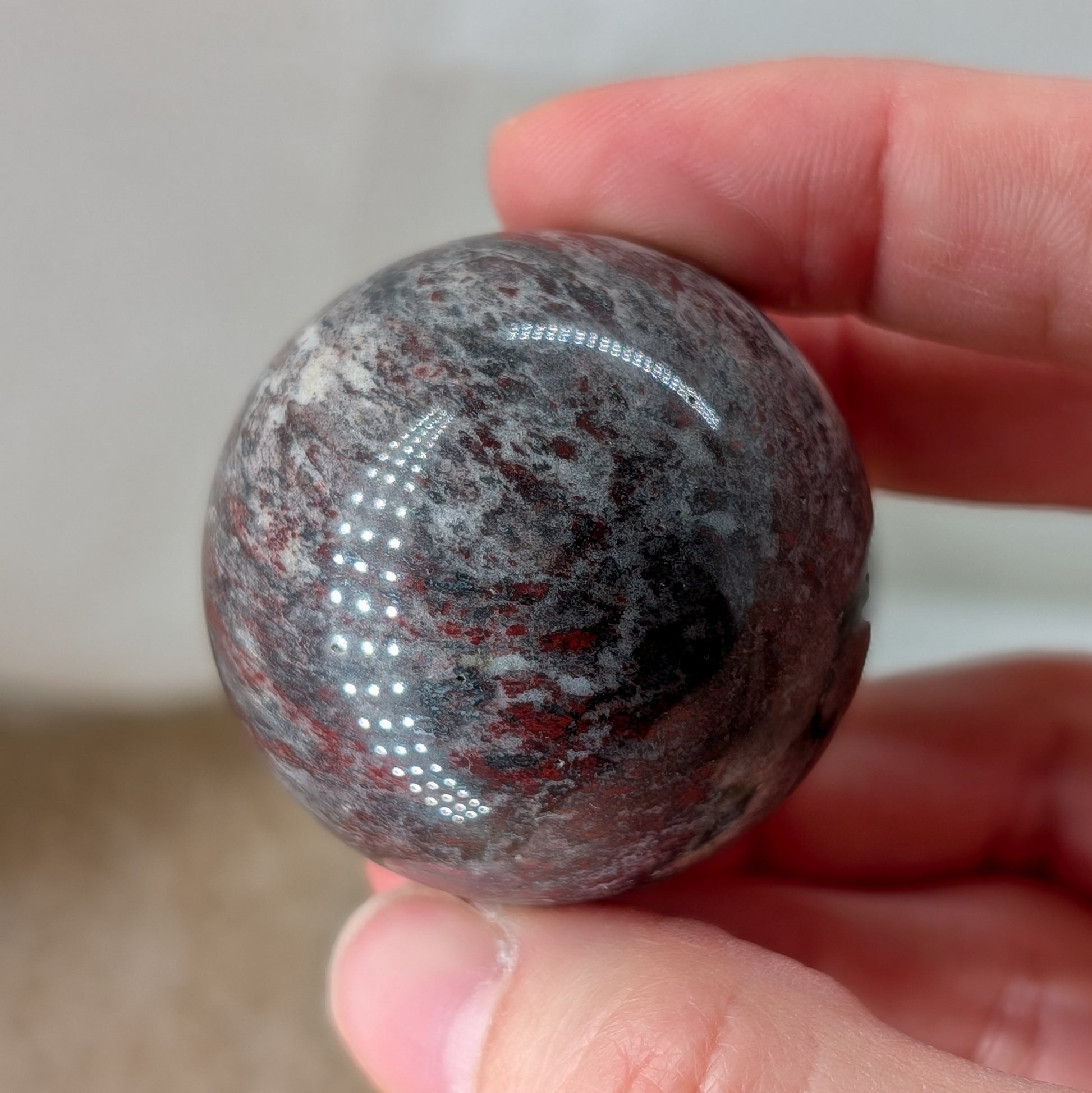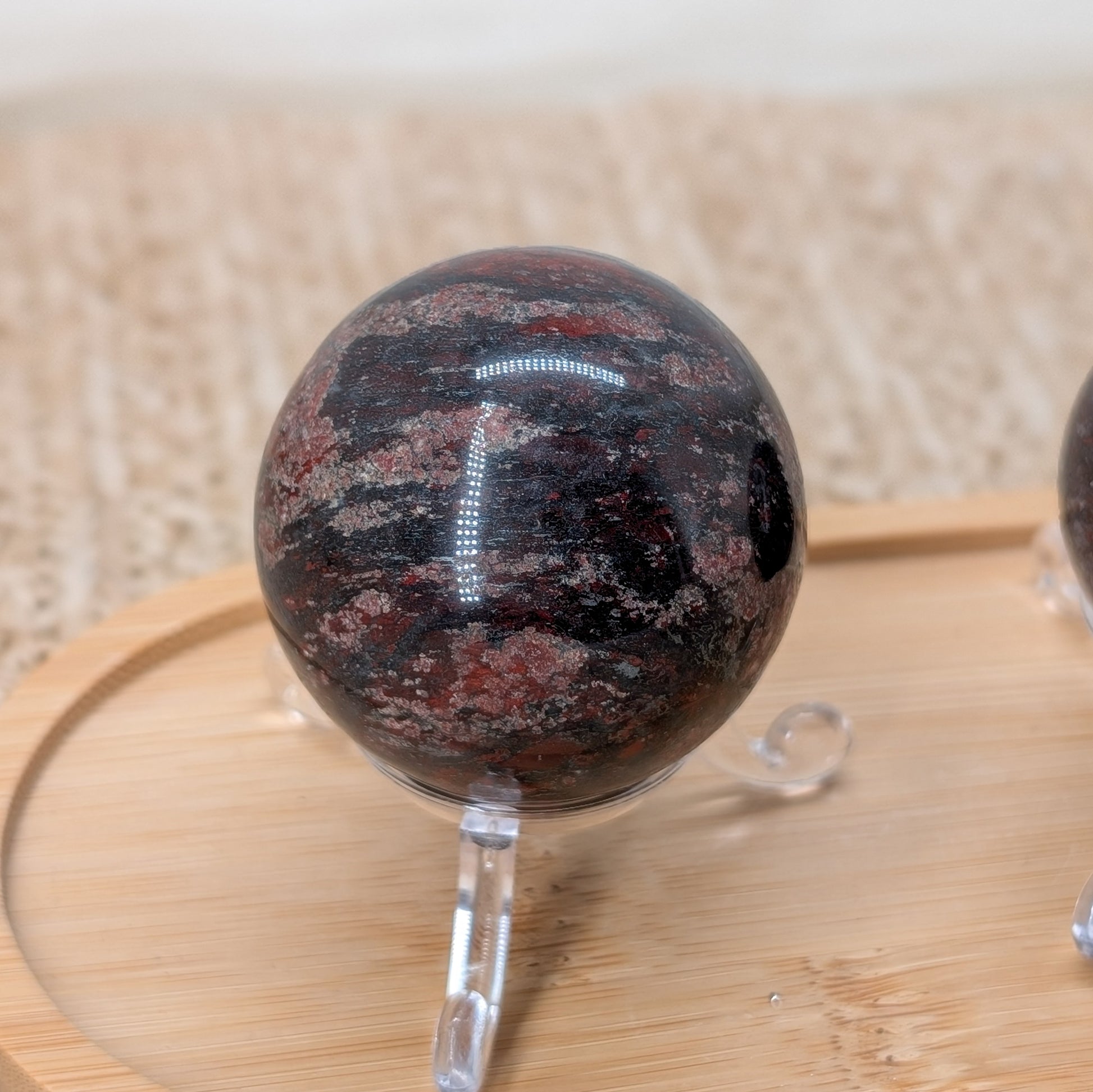 Hämatit gemischt mit rotem Jaspis in Kugelform – verfügbar in zwei Varianten.