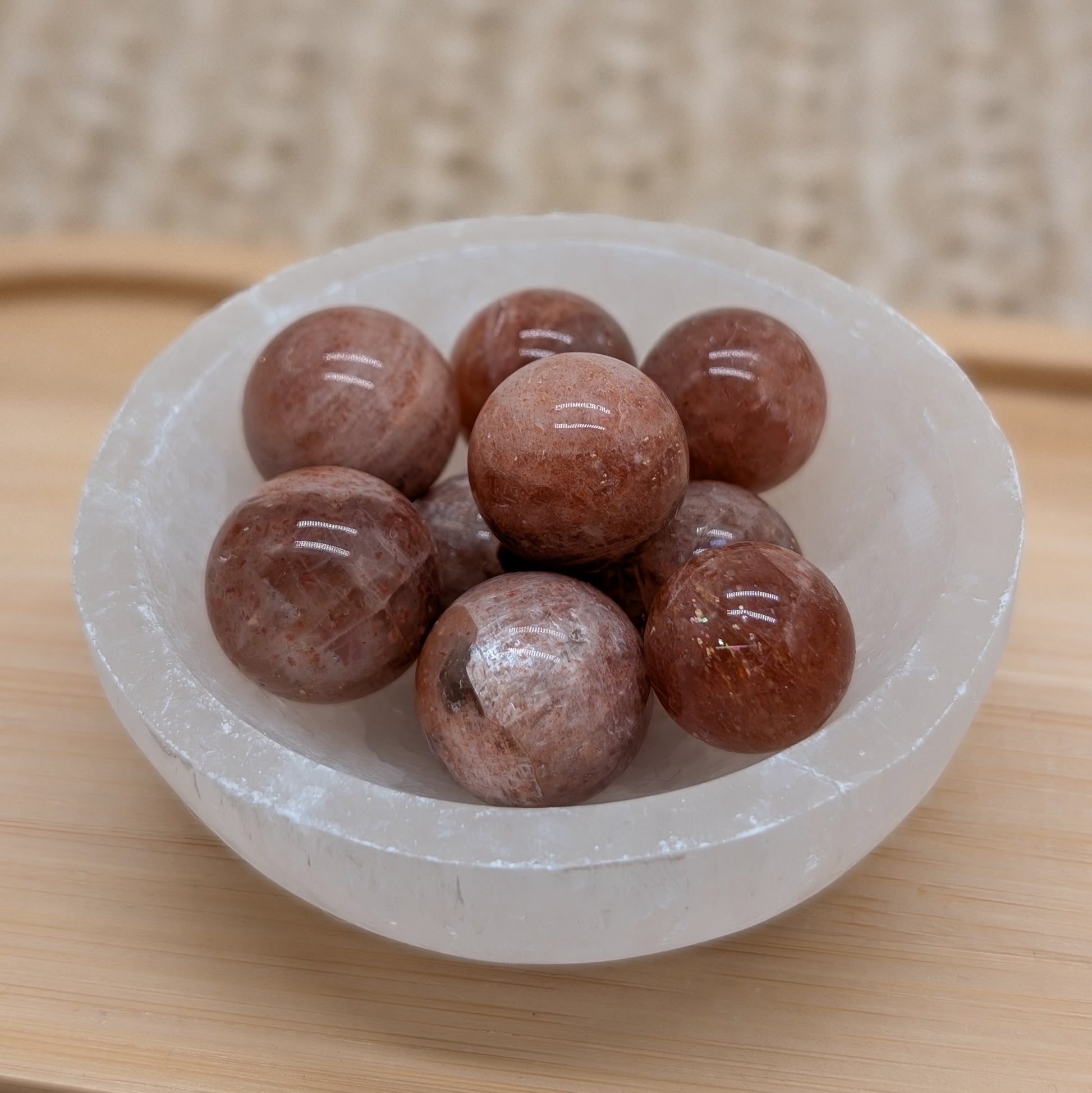 Mini Sonnenstein Kugel mit glitzernden Einschlüssen und Silberflash in schöner Steinqualität.