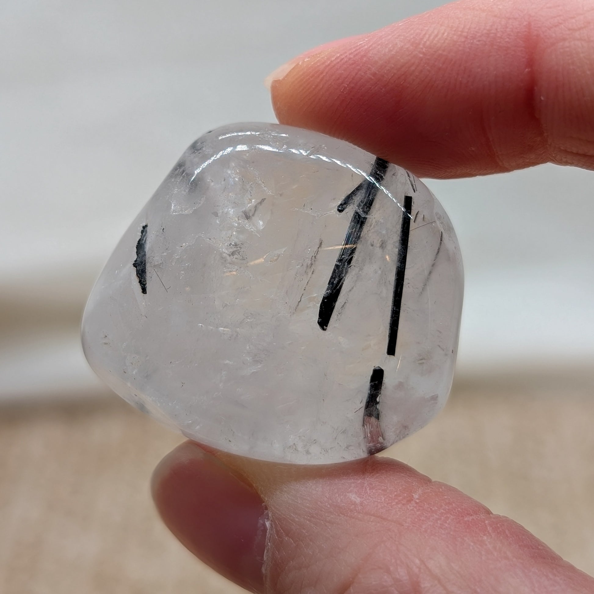 Der Turmalinquarz ist sehr transparent mit deutlichen Turmalinnadeln im Stein und schönem Schimmer.
