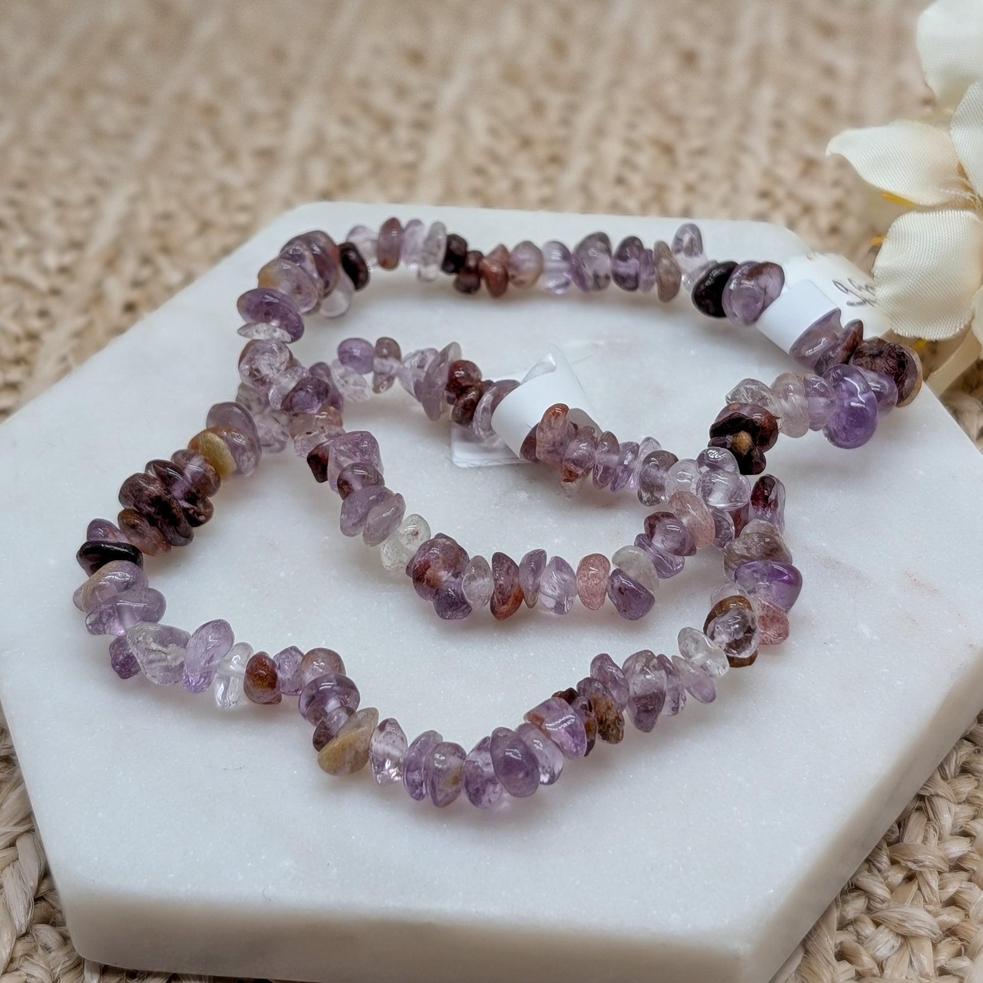 Kakoxenit Splitterarmband auf elastischem Gummiband. Kakoxenit wird zum Teil auch als Super Seven verkauf.