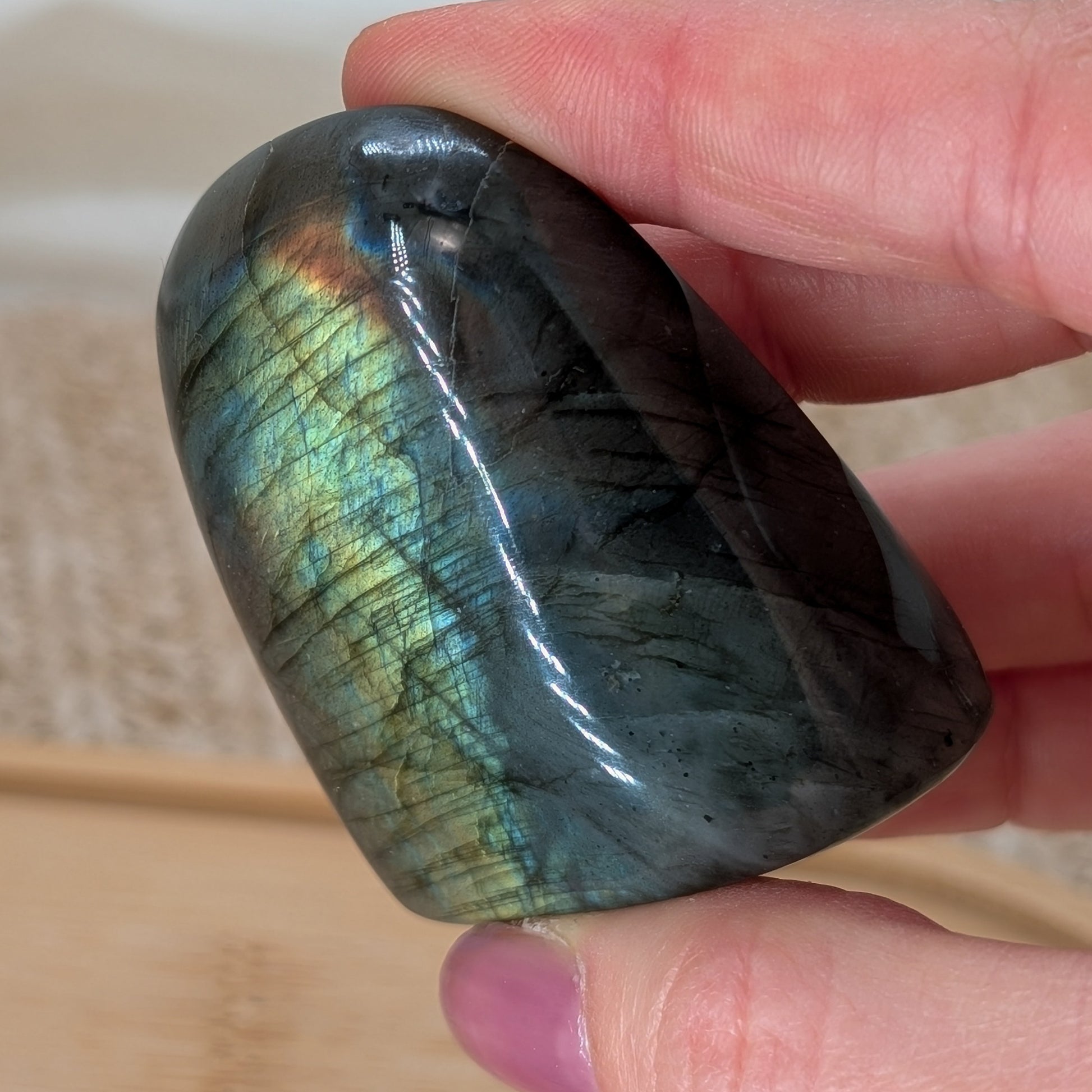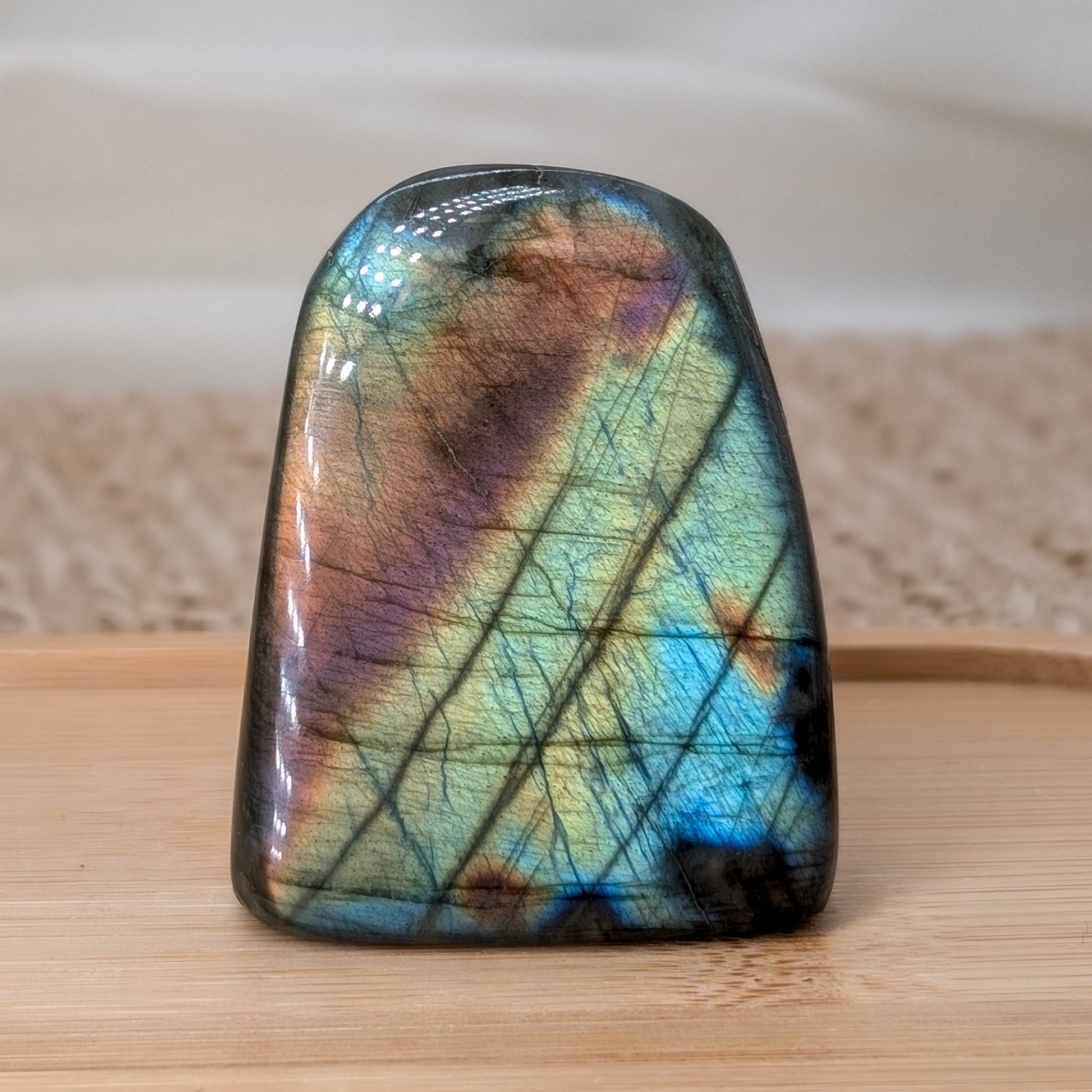 Glitzernde Labradorit Freiform mit ausgeprägtem Flash auf Vorder- und Rückseite.