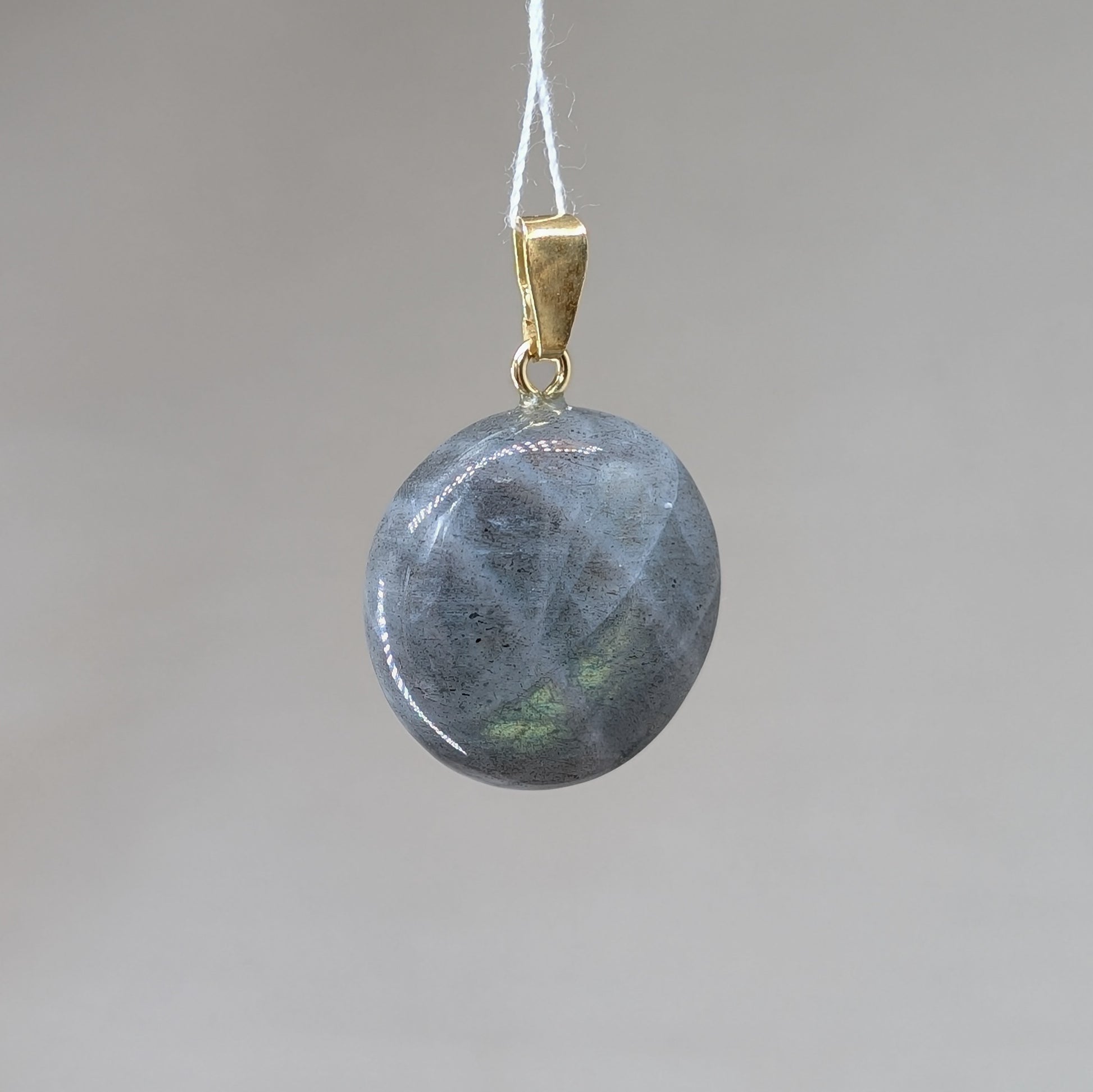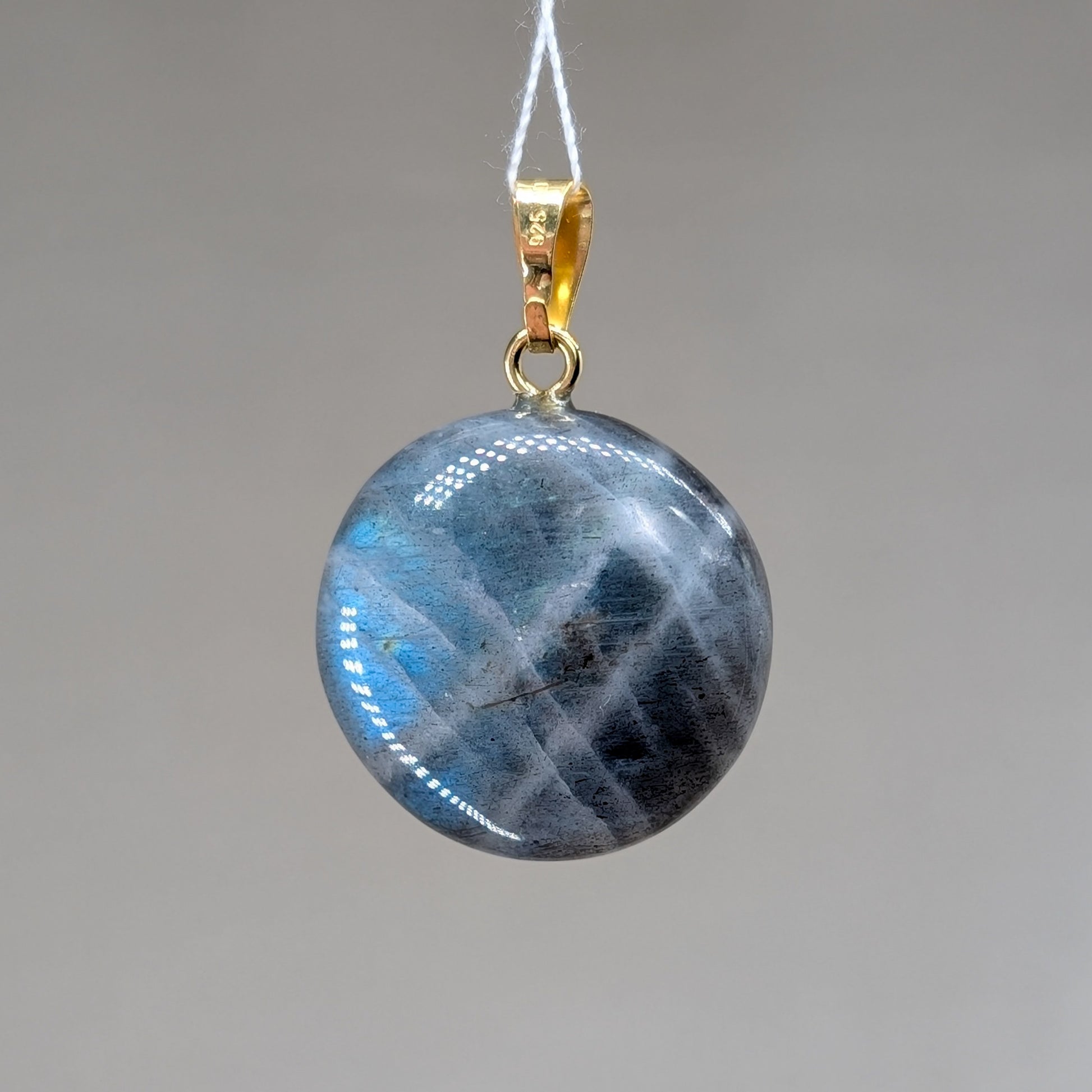 Runder Labradorit Kettenanhänger mit ausgeprägtem Türkisflash – mit Öse aus 925er Silber vergoldet.