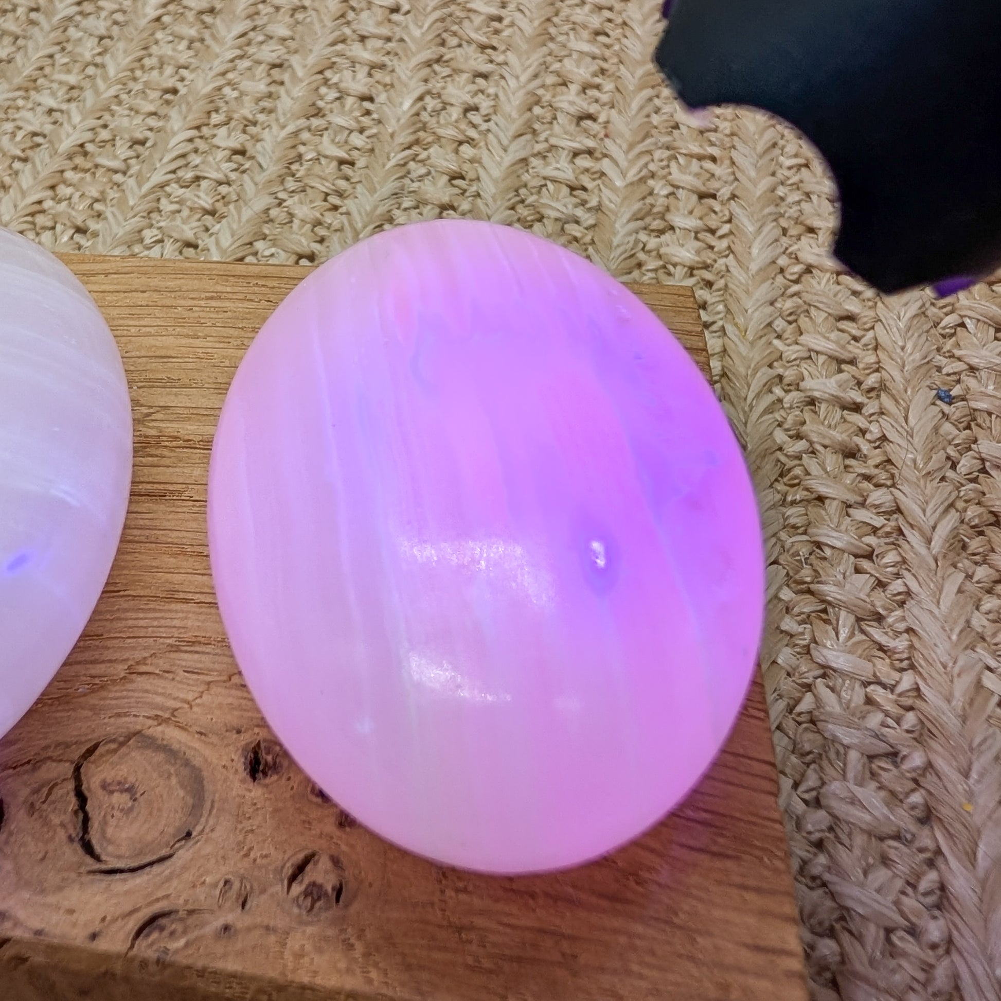 UV-reaktiver Handstein aus rosa Mangano / pinkem Calcit in 3 Varianten.