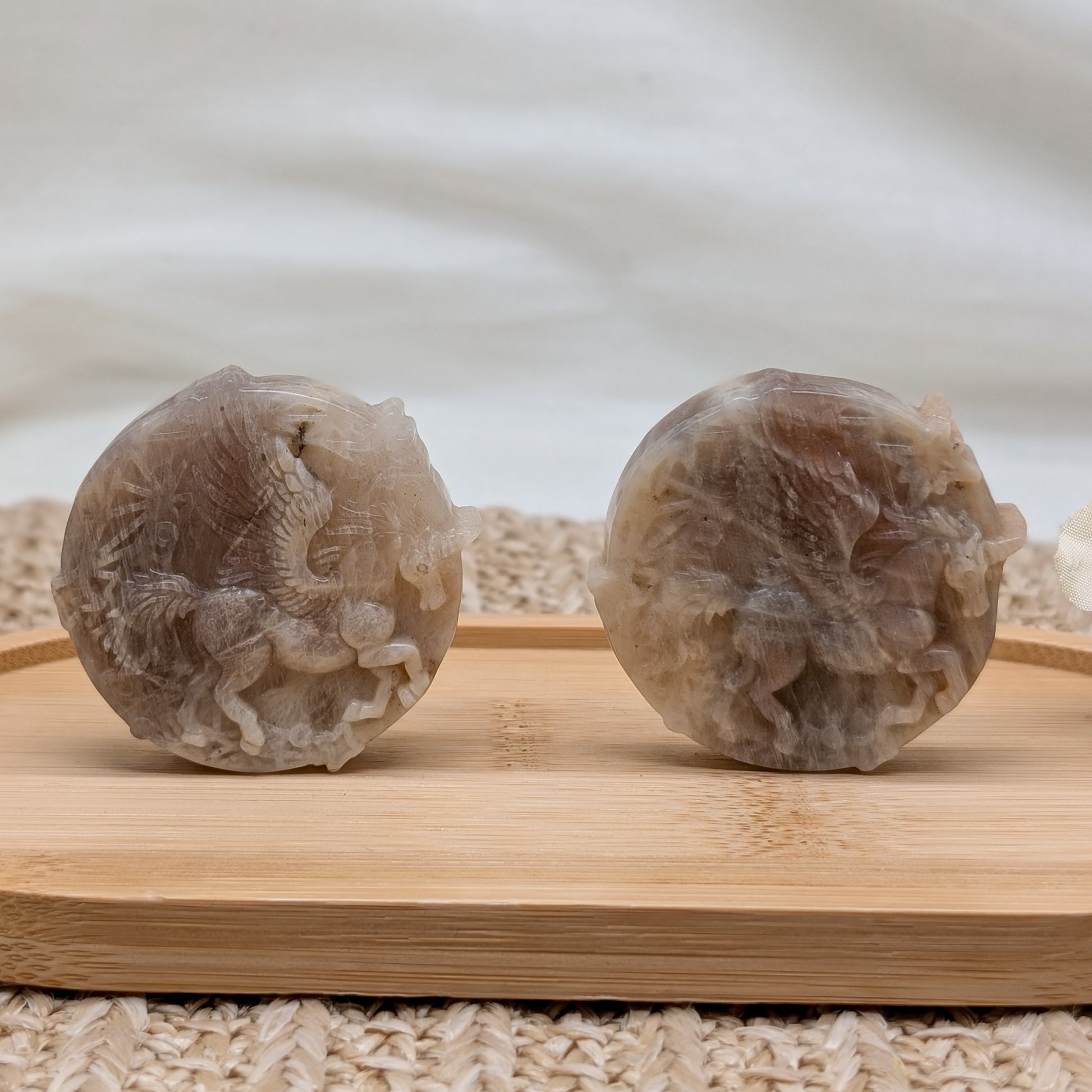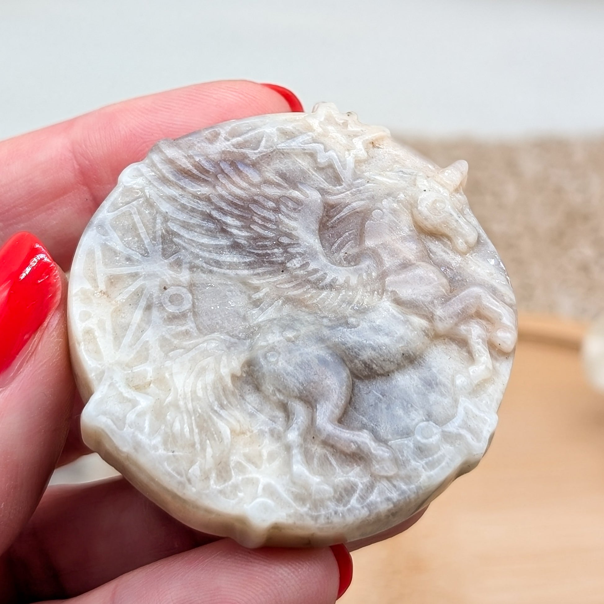 Mondstein Schnitzerei mit Einhorn / Pegasus mit silbernem und blauem Flash