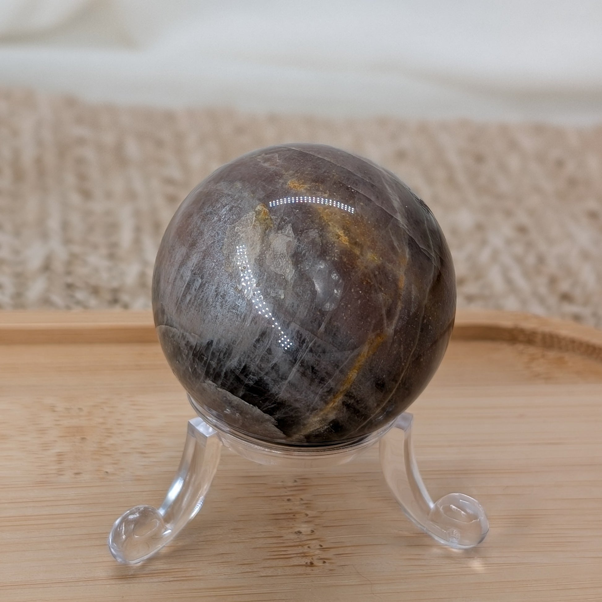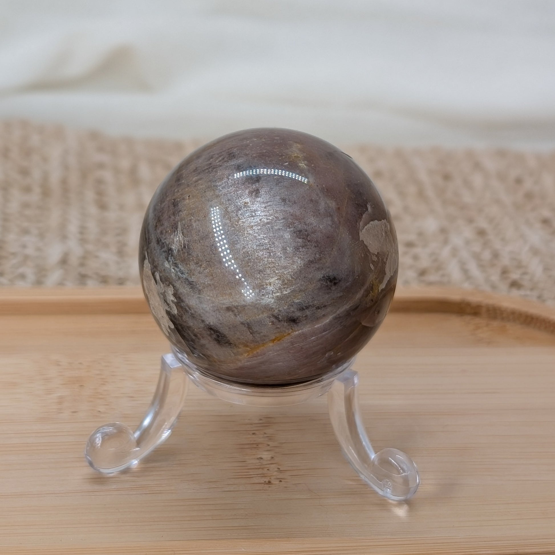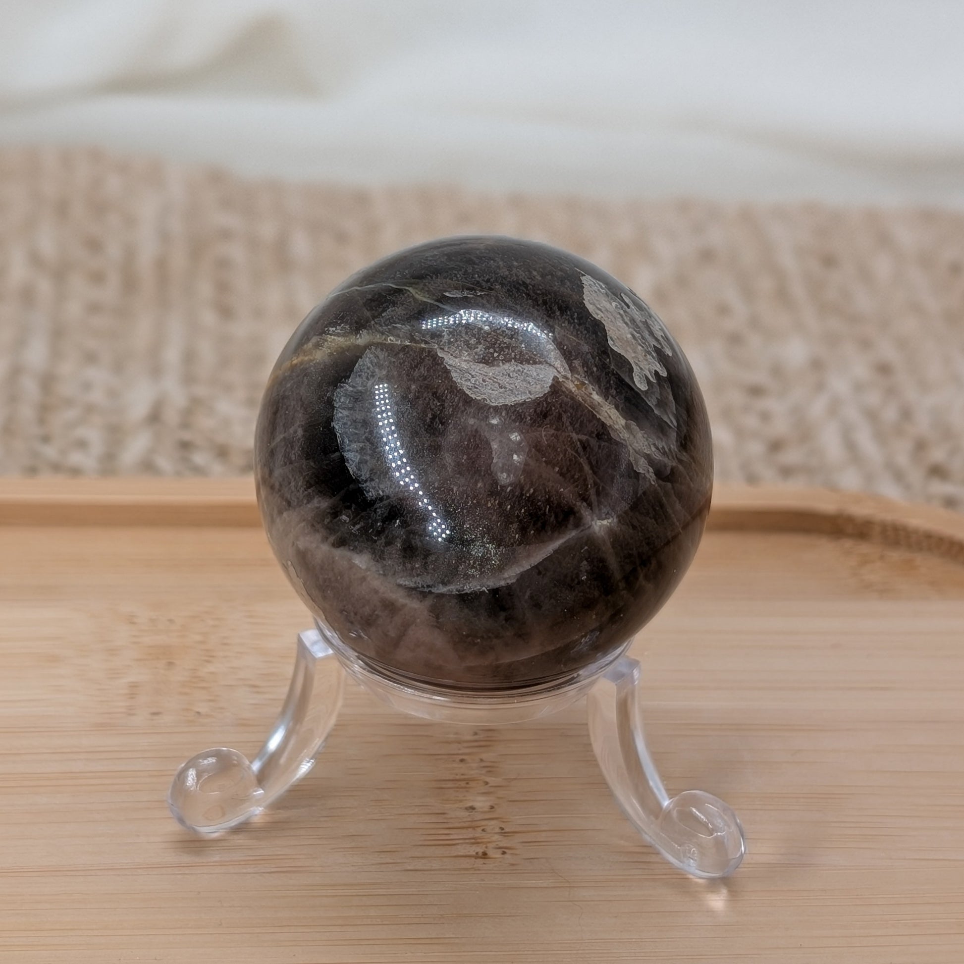 B-Ware Kugel aus schwarzem Mondstein mit Silberflash.