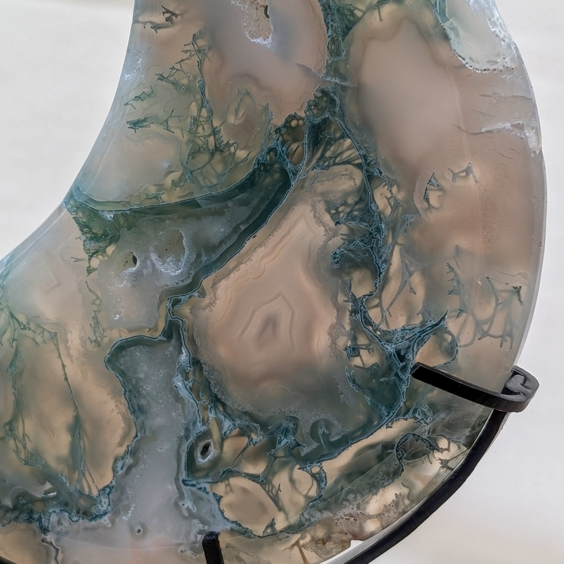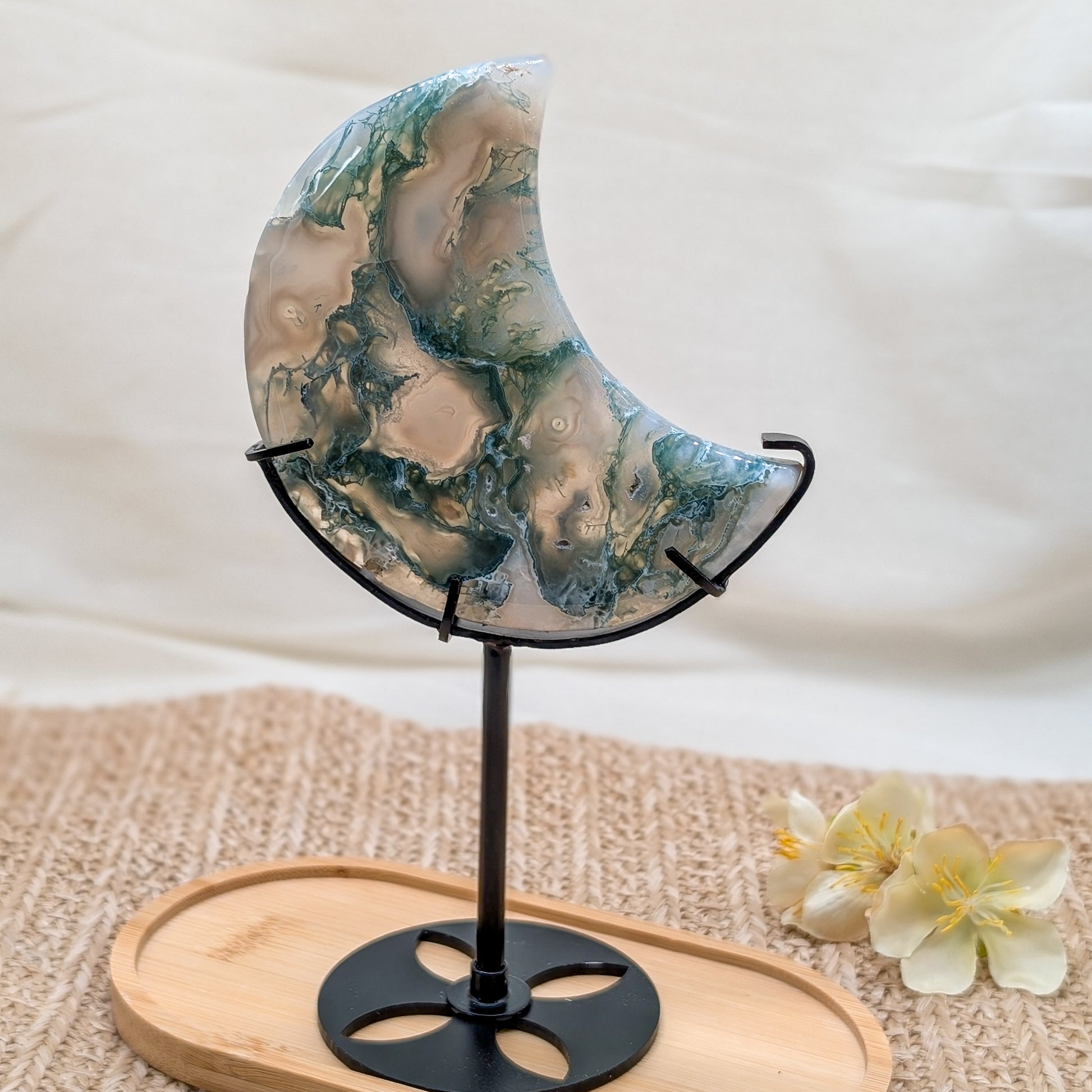 Schön gemusterter Moosachat Mond mit kleinen Drusen und Quarz-Anteil auf matt schwarzem Ständer