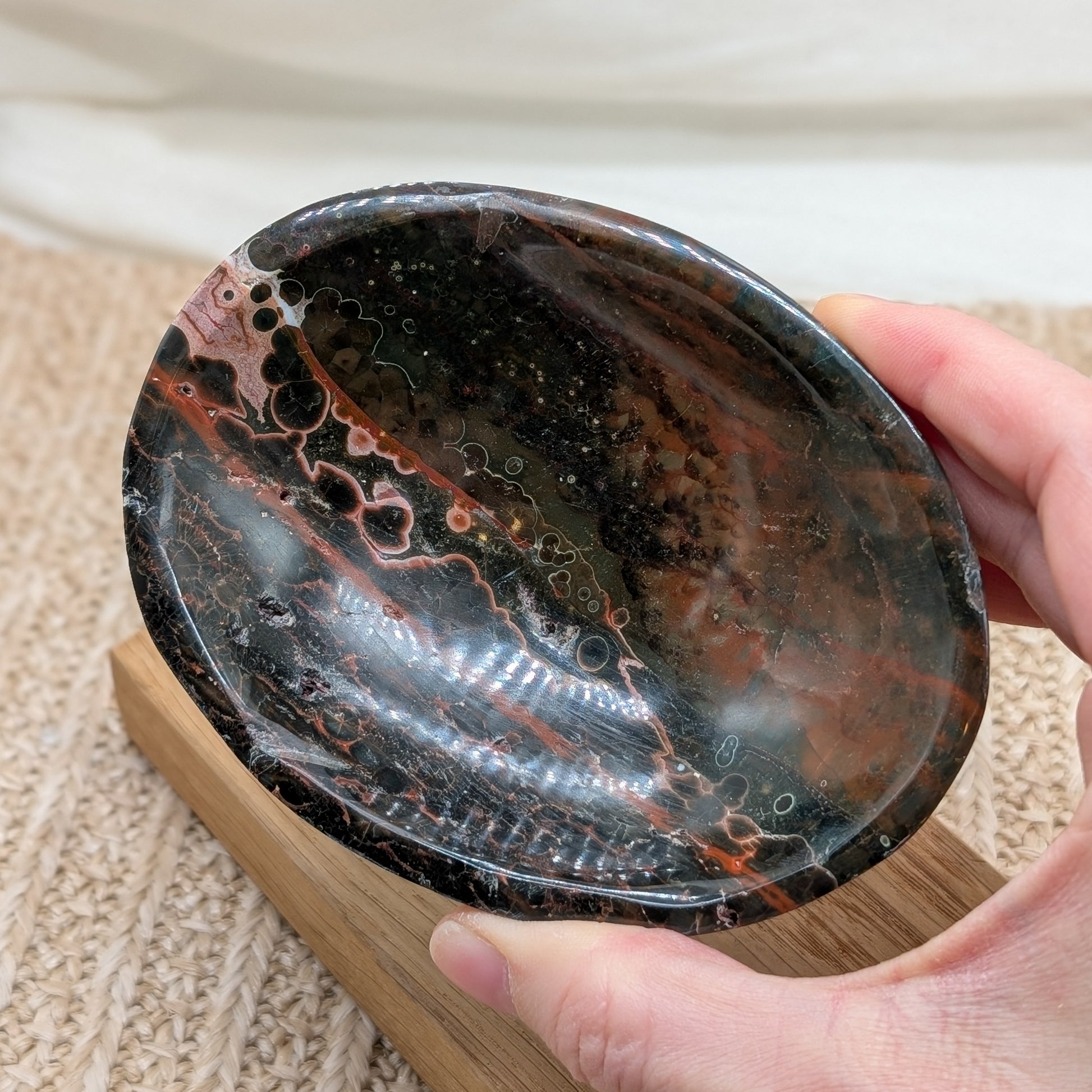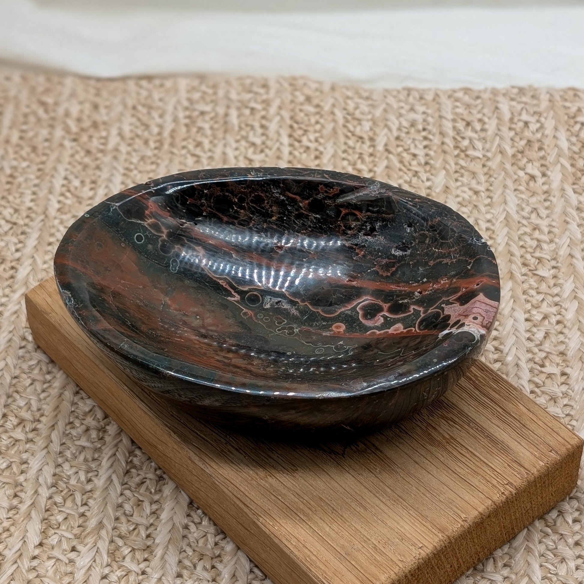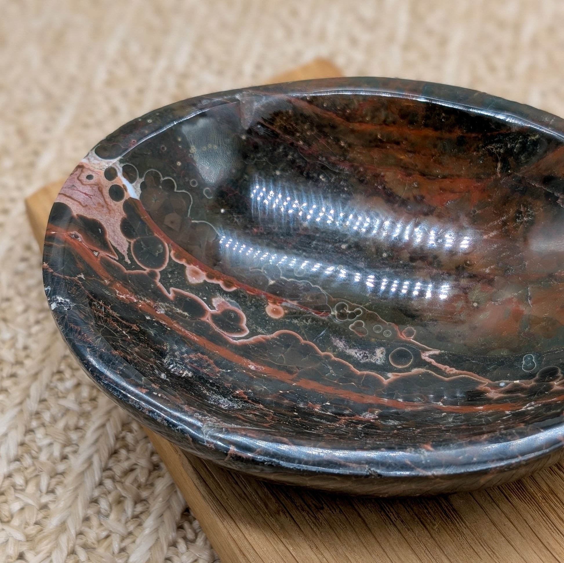Ovale Schale aus Ozeanachat mit schöner Musterung in rot und dunkelgrün / schwarz