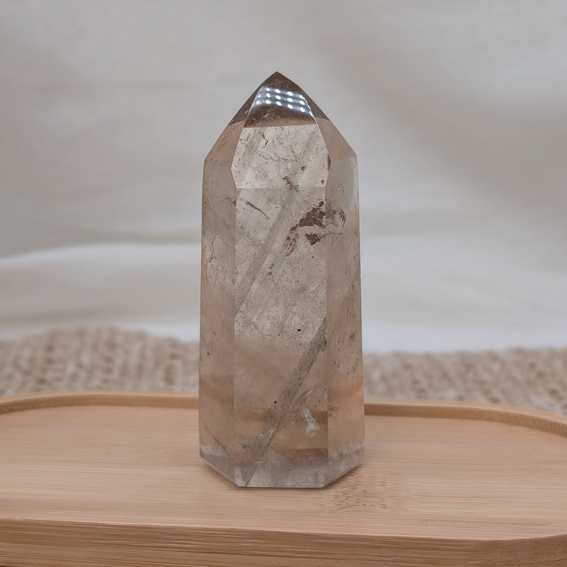 Rauchquarz Turm mit sehr schönen Einschlüssen und mini Regenbögen.