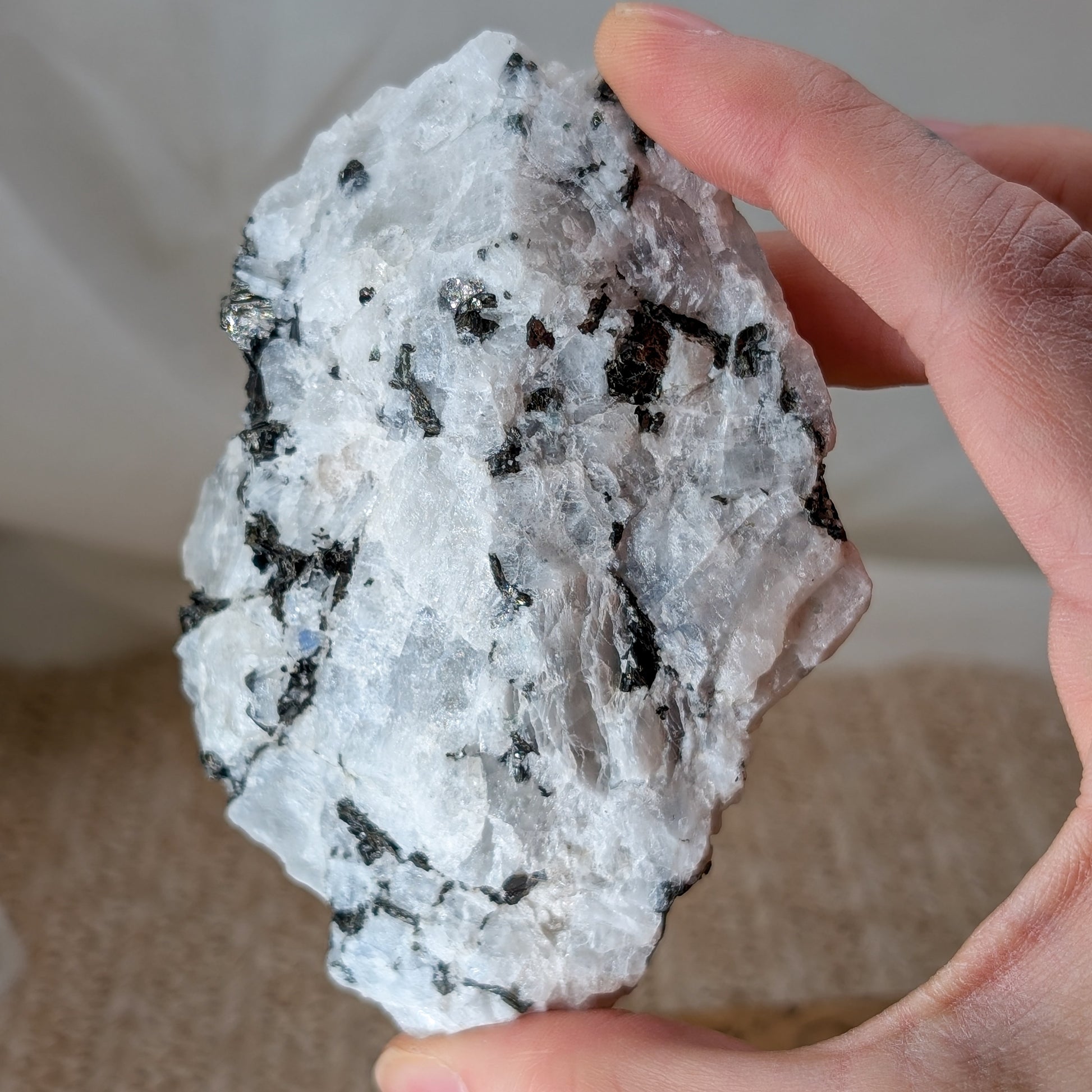 Funkelndes Regenbogen Mondstein Rohstück mit Einschlüssen aus schwarzem Turmalin
