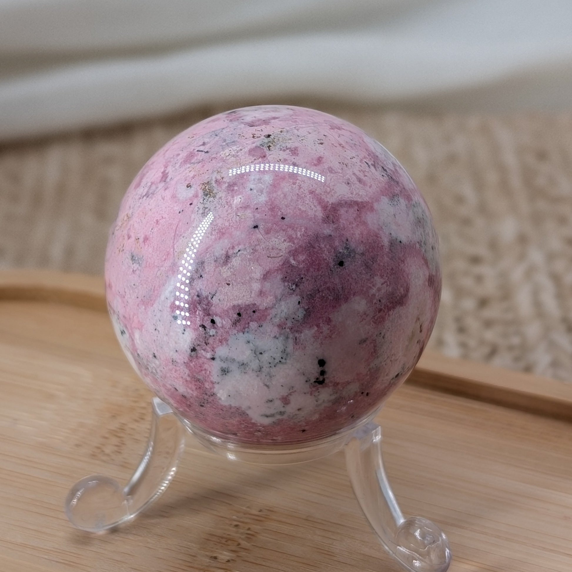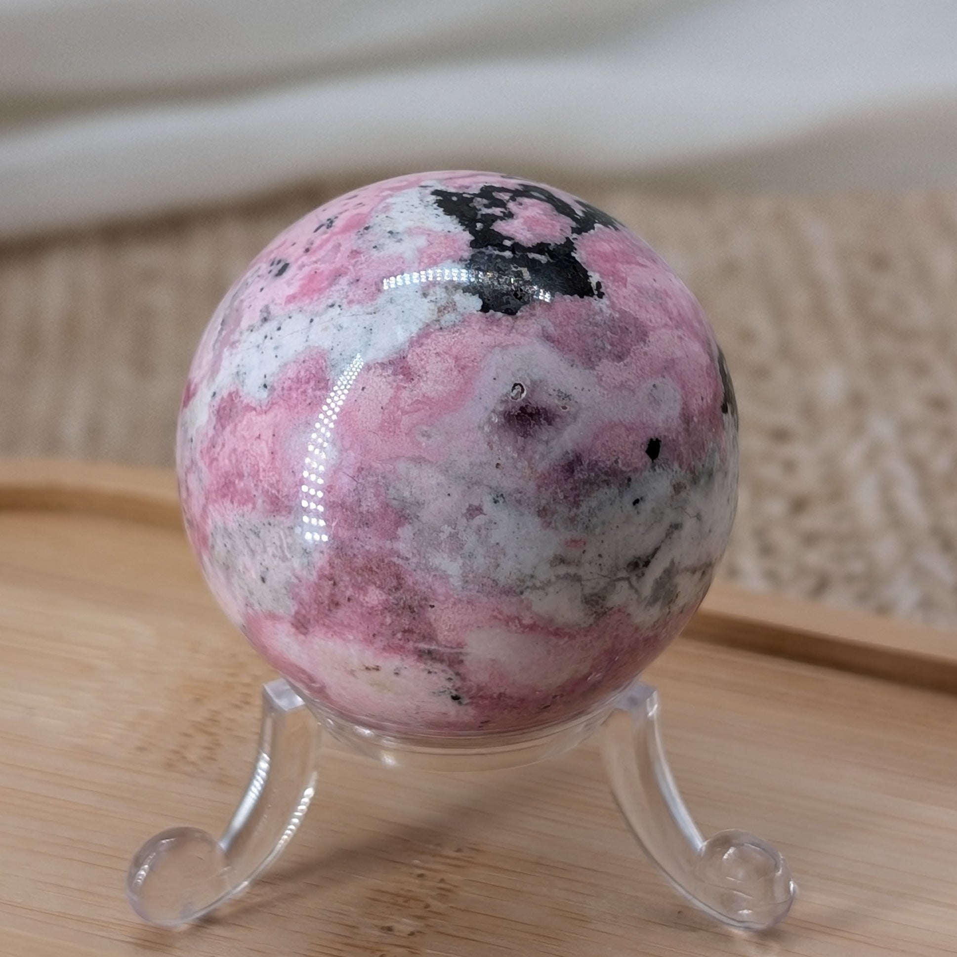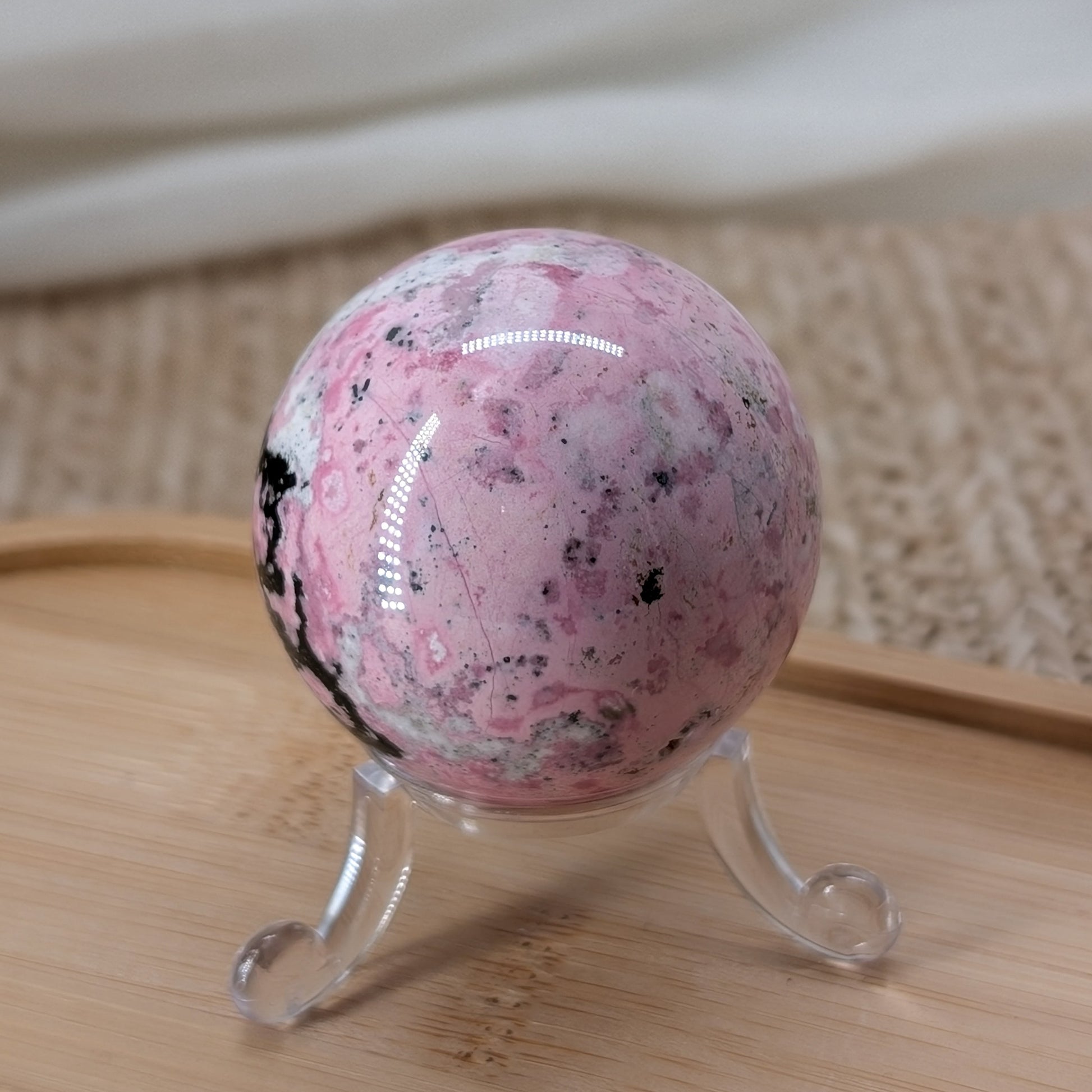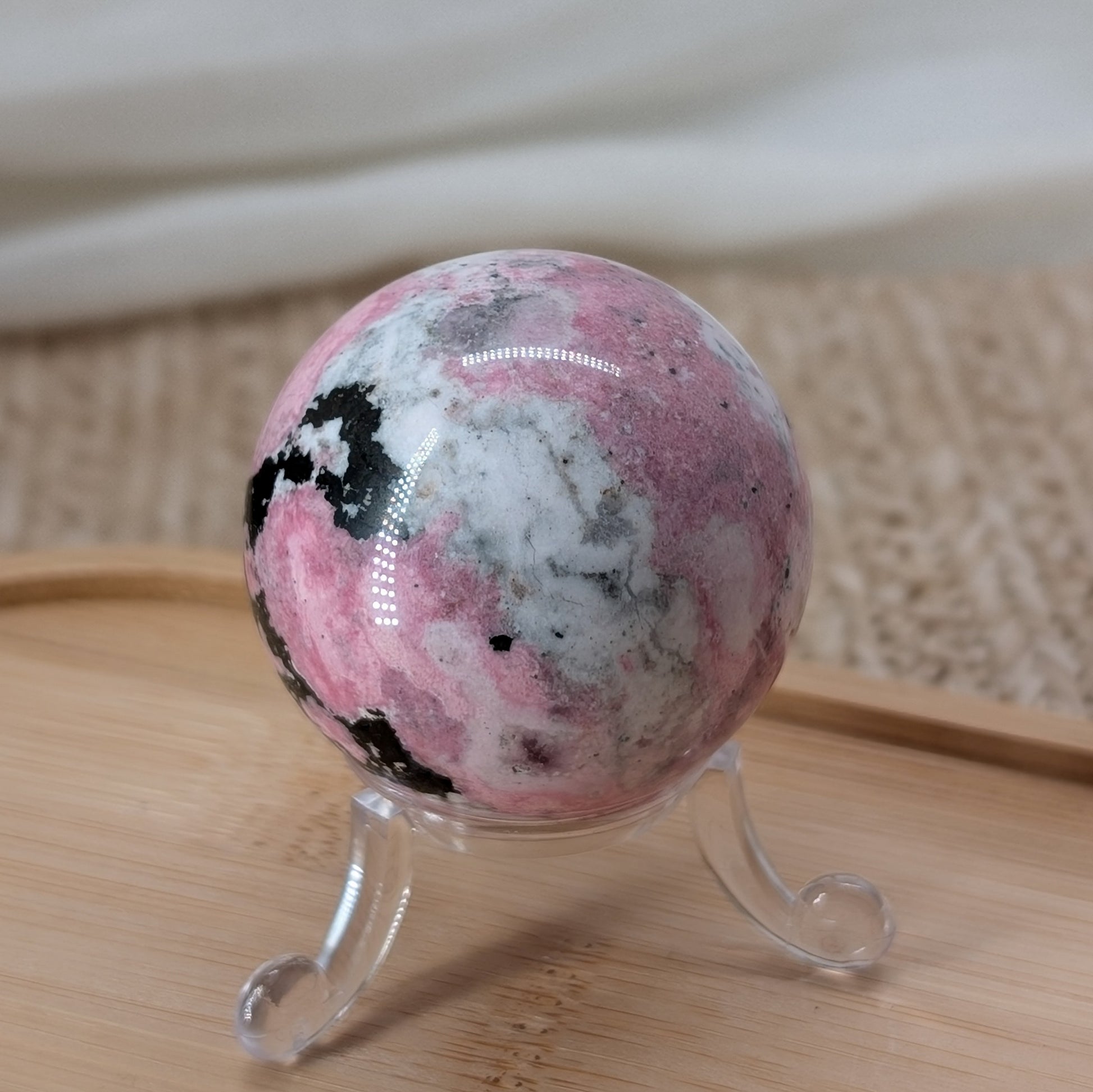 Pinker Rhodonit Kugel aus Peru in schöner rosa Farbe mit weißen und schwarzen Anteilen