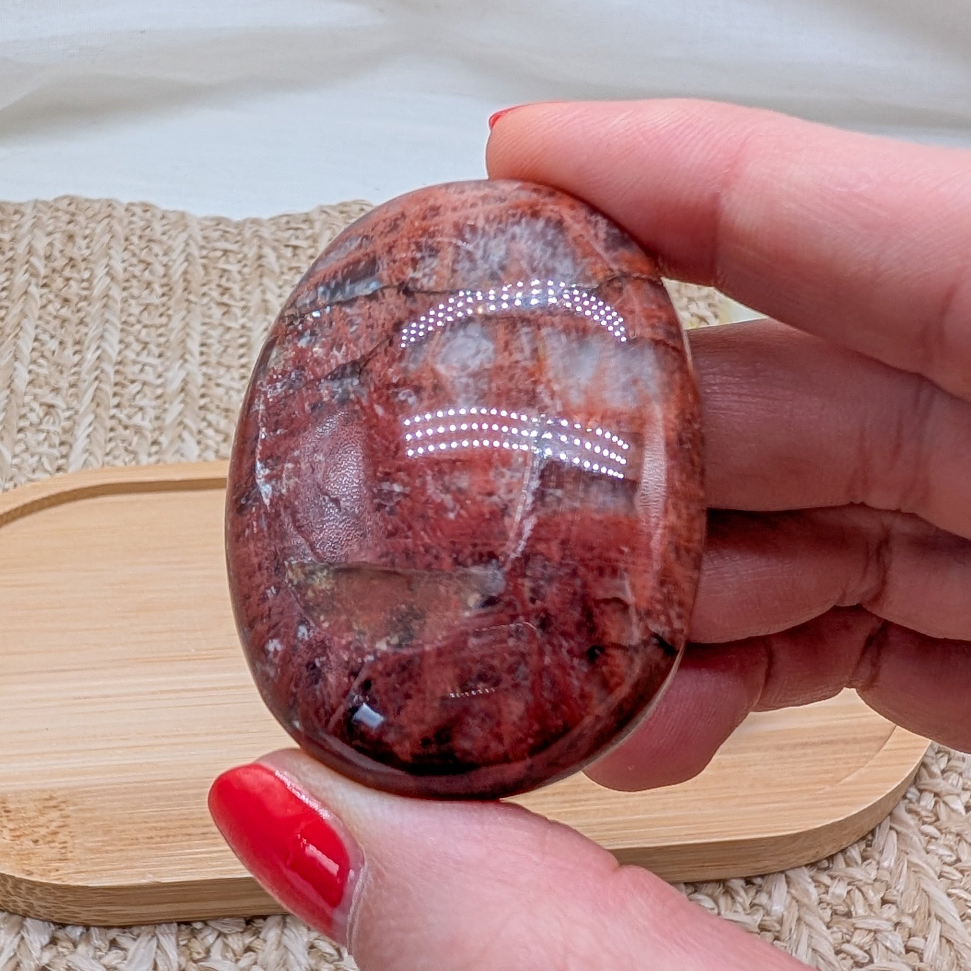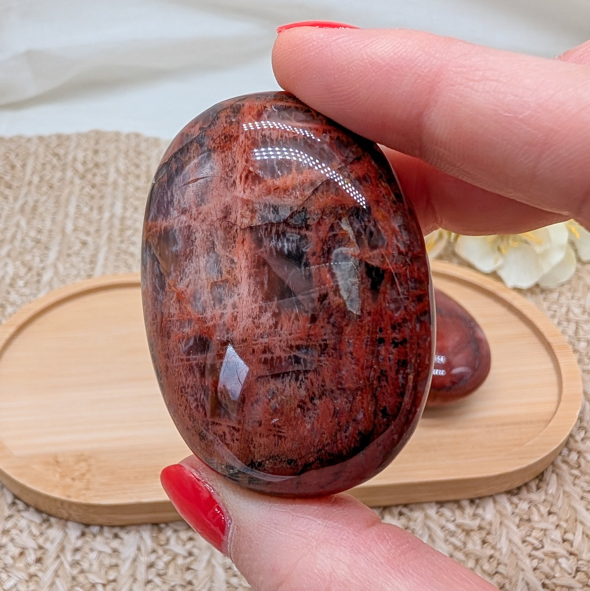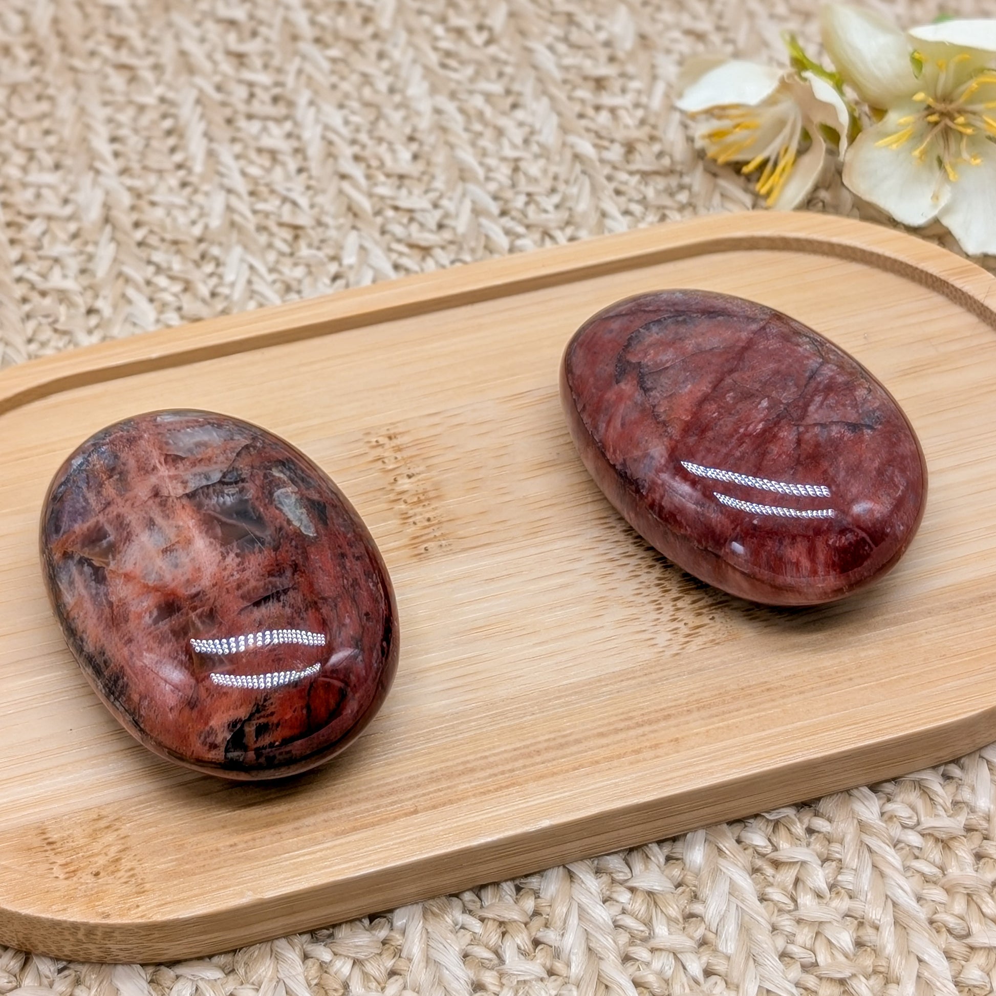 Roter Mondstein Handstein in zwei Varianten – beide in dunklem rot mit Silberflash / Schimmer.