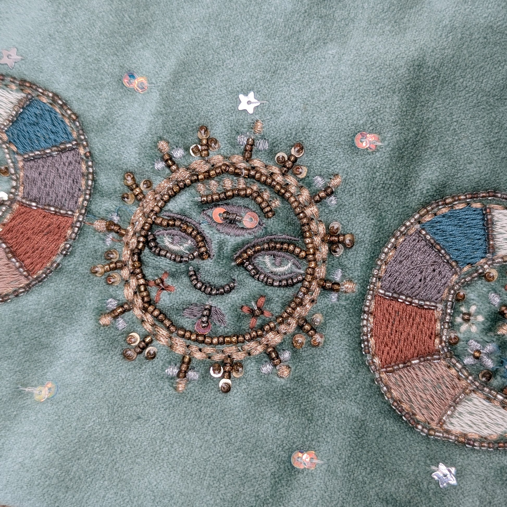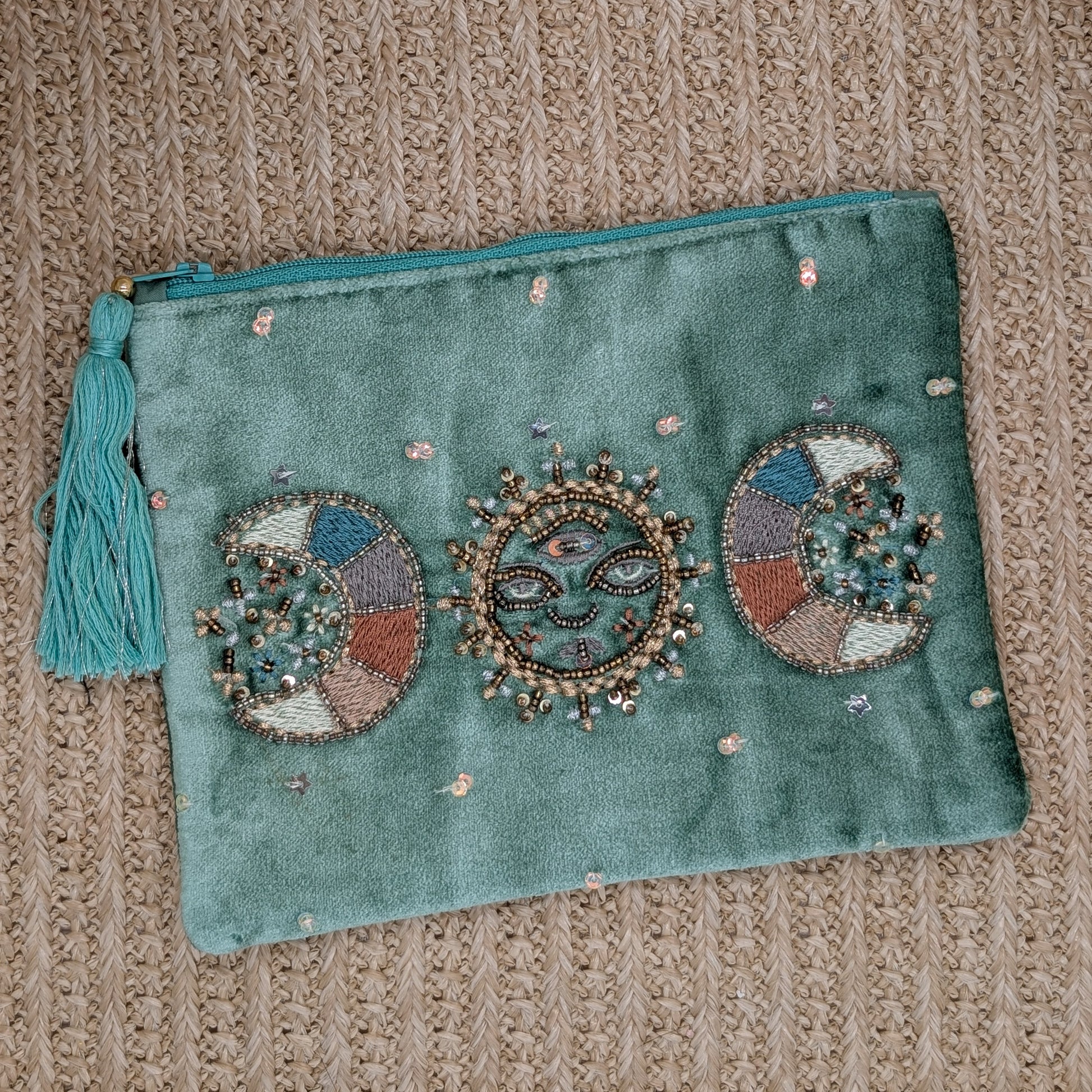 Bestickter Samtbeutel zur Aufbewahrung von Schmuck, Tarotkarten, Trommelsteinen oder anderen Schätzen. Verschließbar mit Reißverschluss.