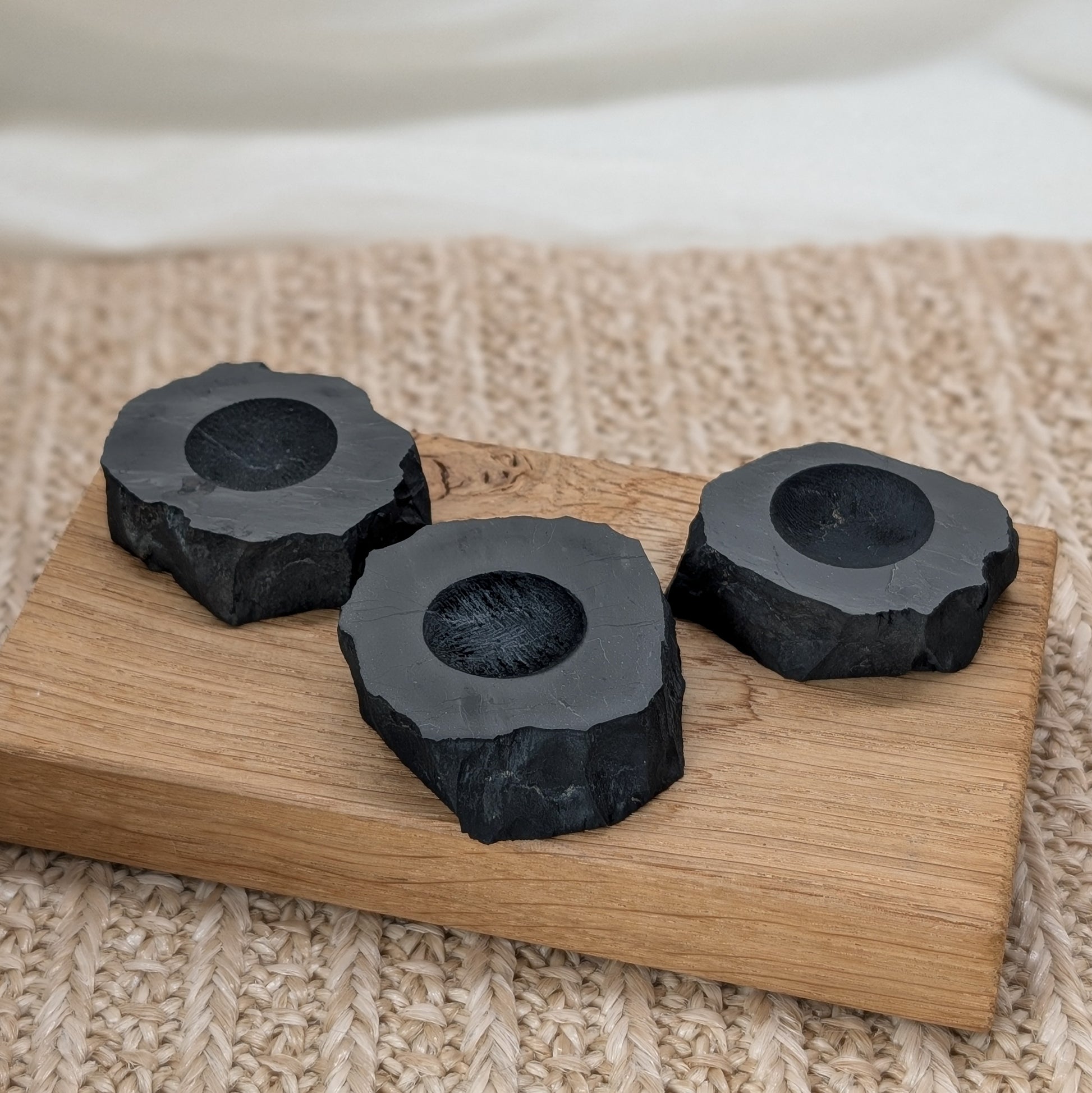 Der Schungit Kugelhalter ist an den Seiten roh und kann daher bei Berührung etwas abfärben. Die Fläche ist poliert.
