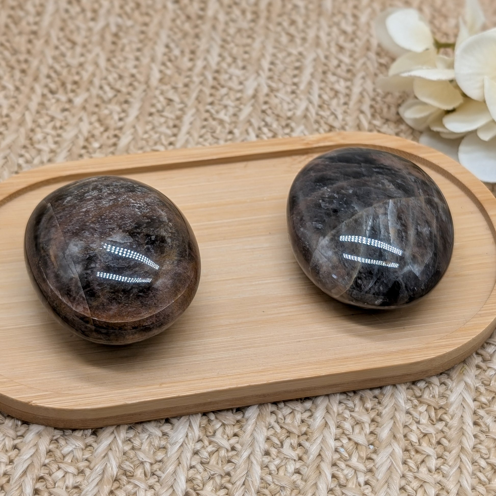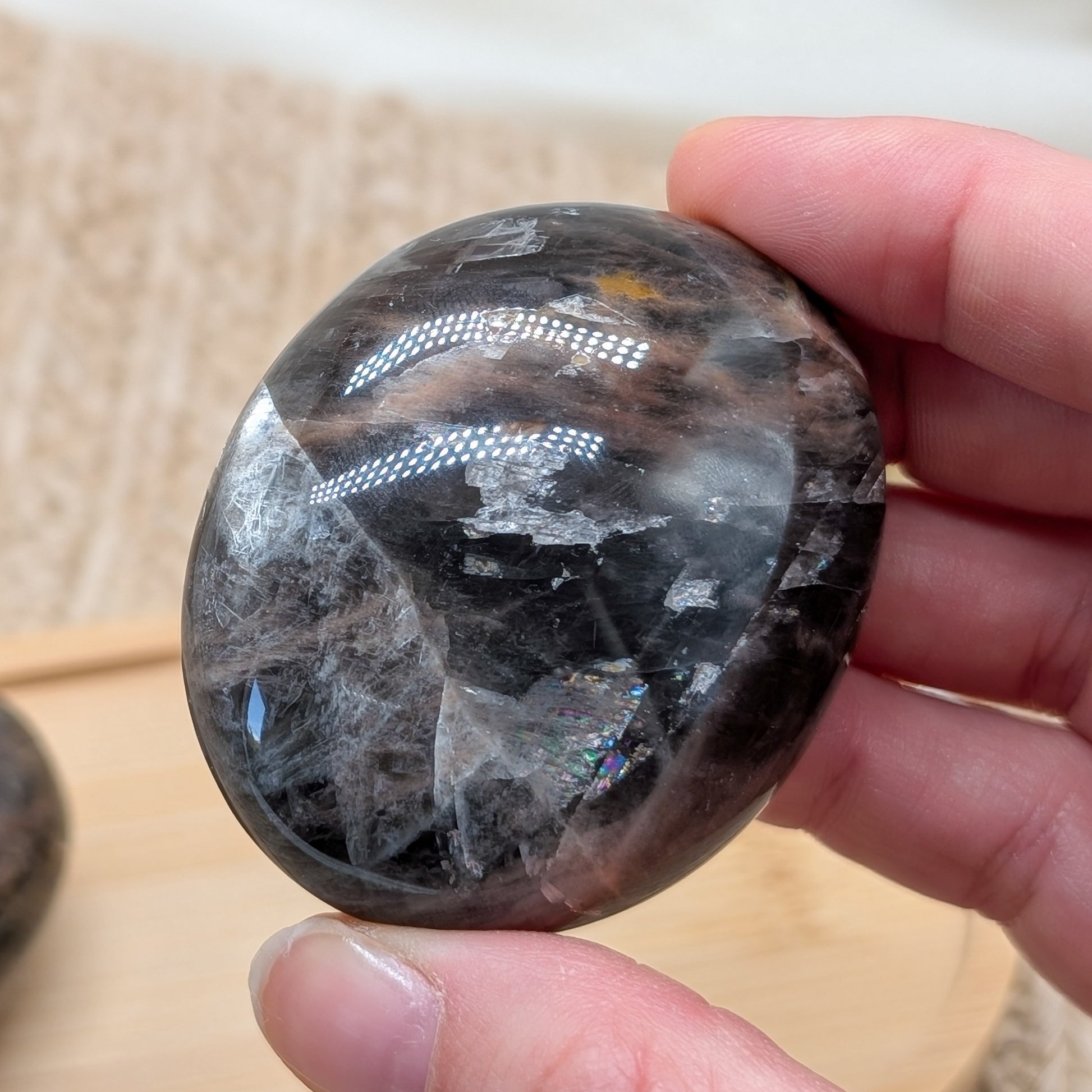 Schimmernder Schwarzer Mondstein Handstein mit Silberflash in 2 Varianten:
