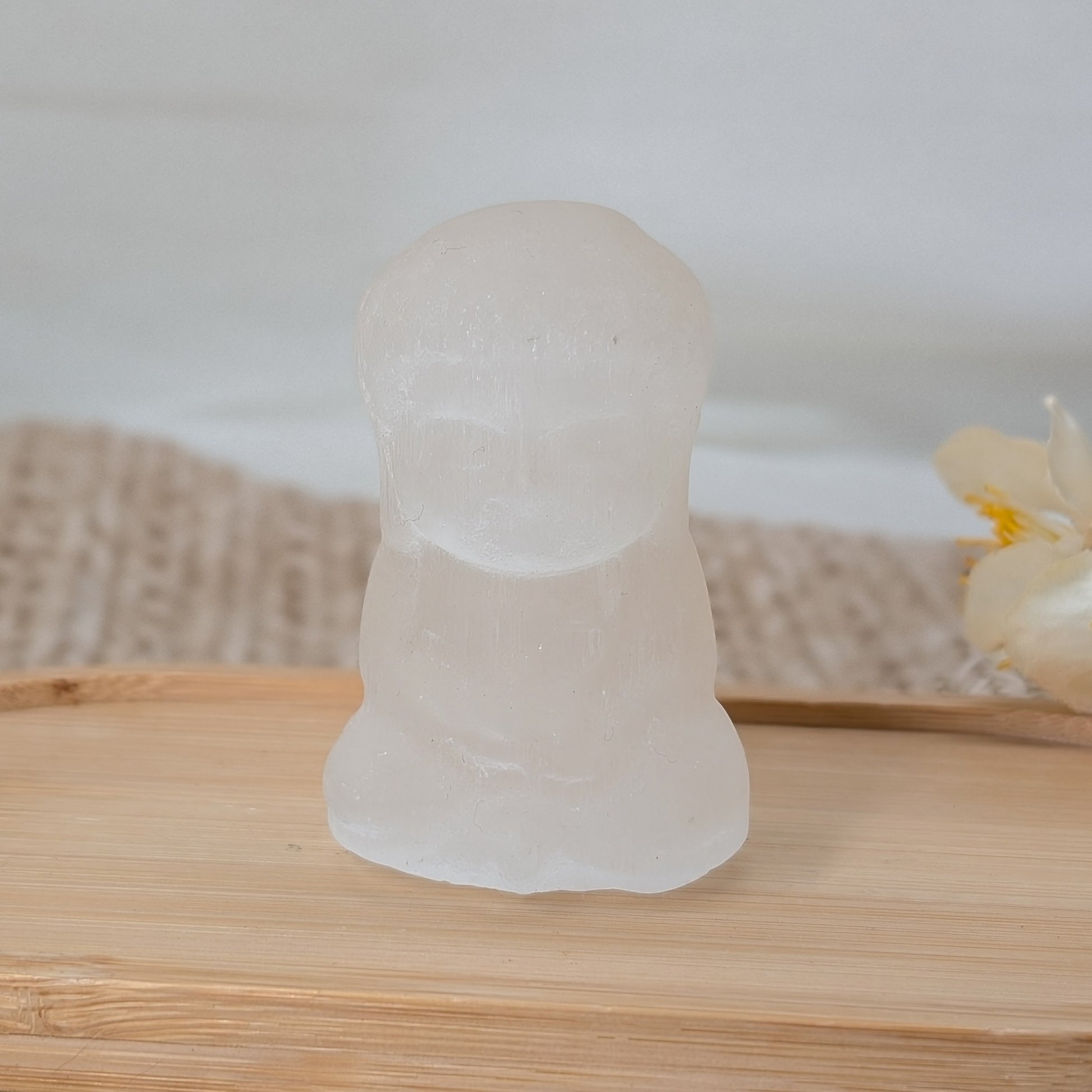 Selenit Buddha Schnitzerei mit sanftem Schimmer
