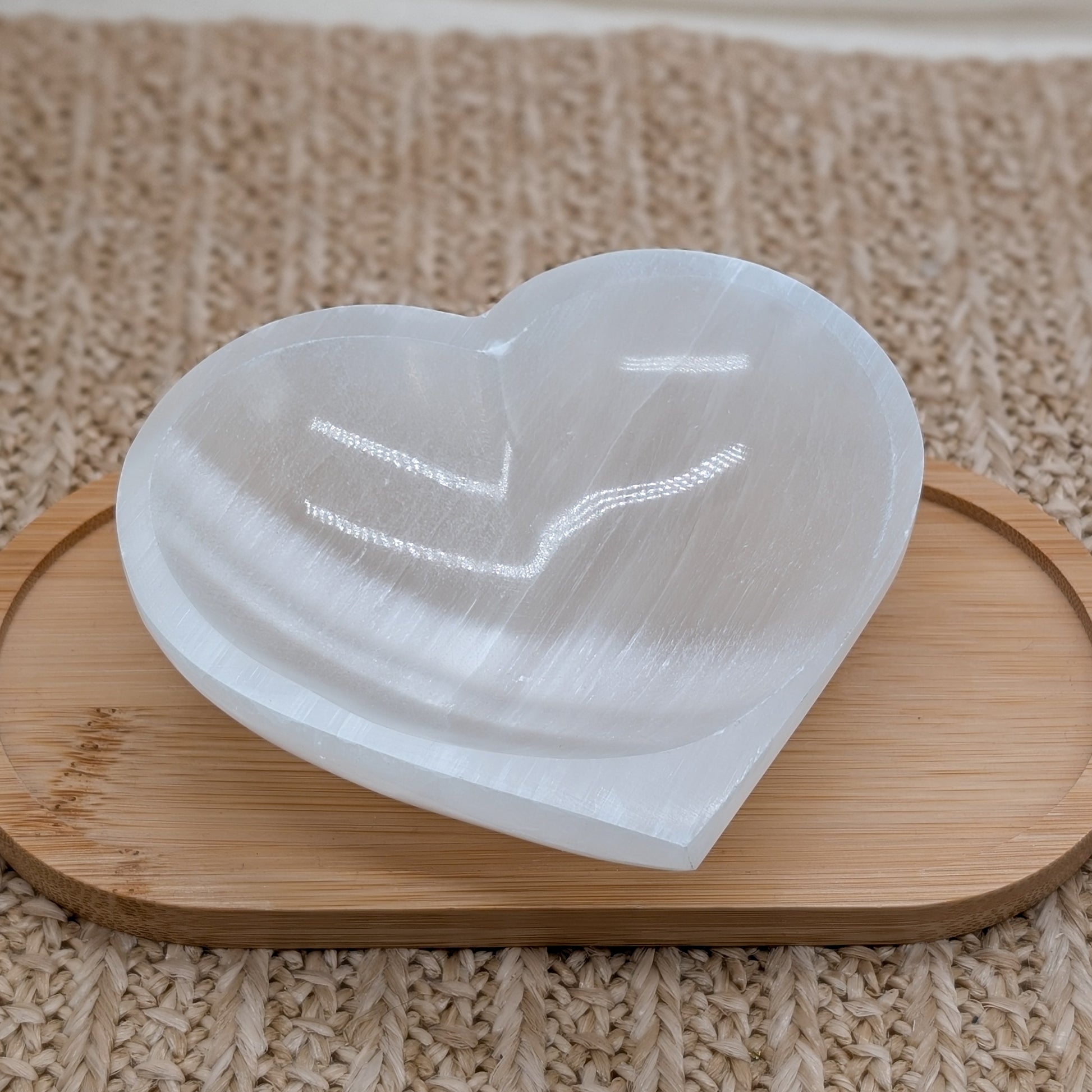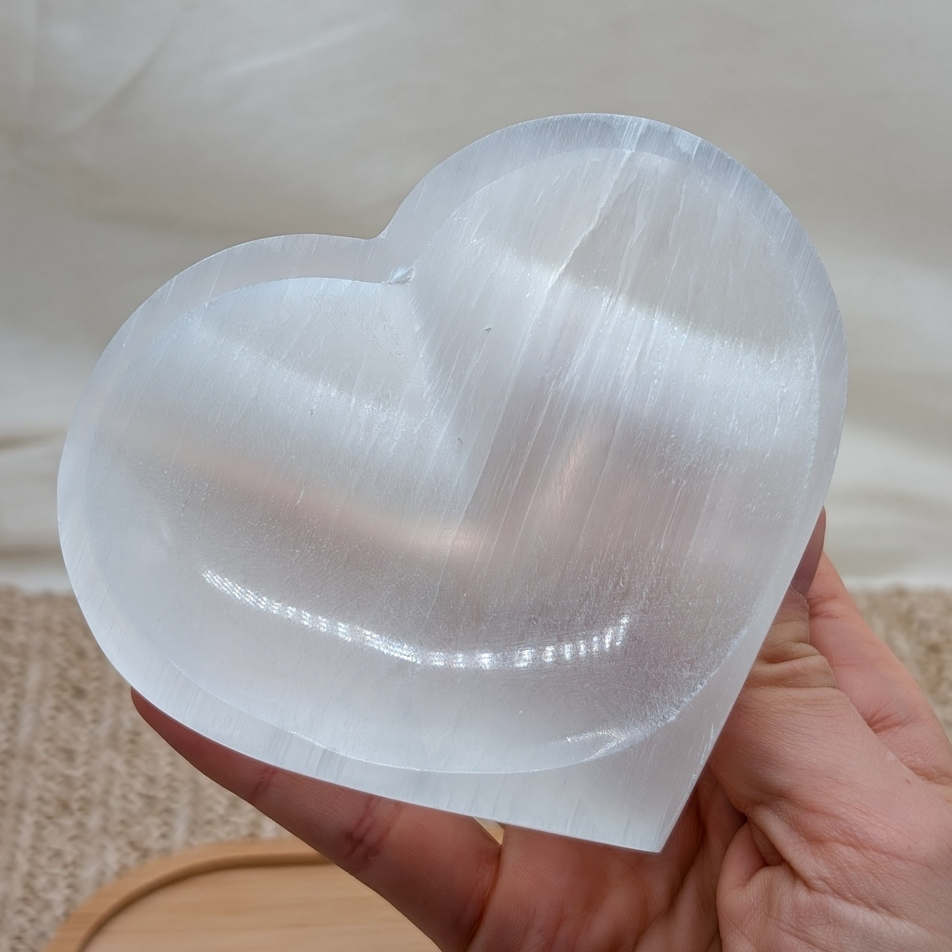Schimmernde Selenit Schale in Herzform. Eignet sich perfekt um kleine Trommelsteine oder Schmuck aufzubewahren.