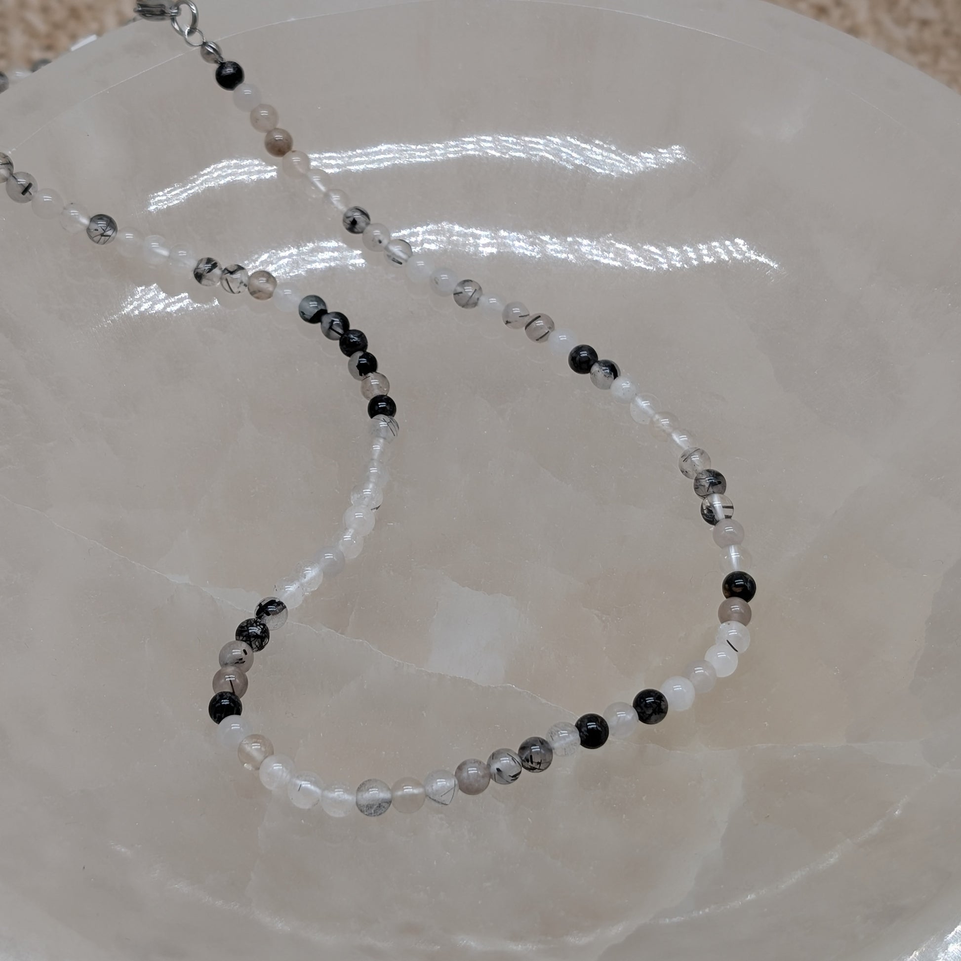 TurmalinquarzHalskette mit Perlen und Edelstahl Verschluss.