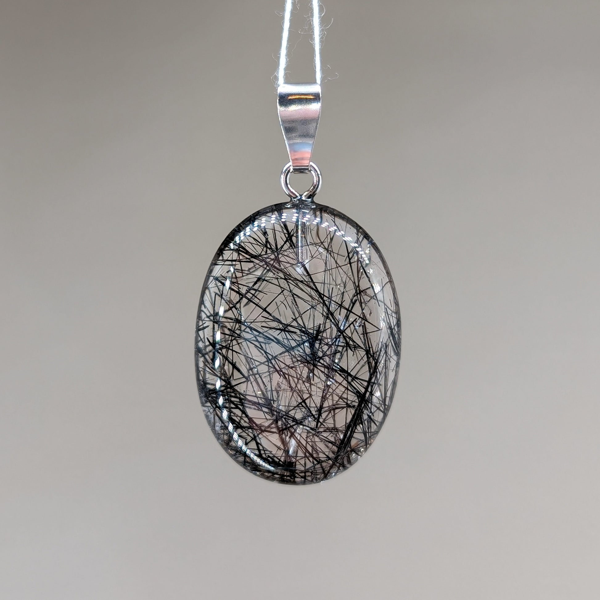 HQ Turmalinquarz Kettenanhänger aus klarem Quarz mit schönen Turmalinnadeln – mit rhodinierter Öse aus 925er Silber